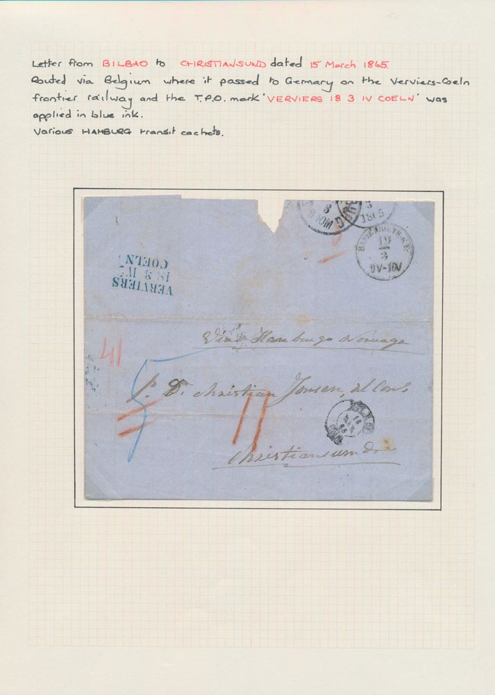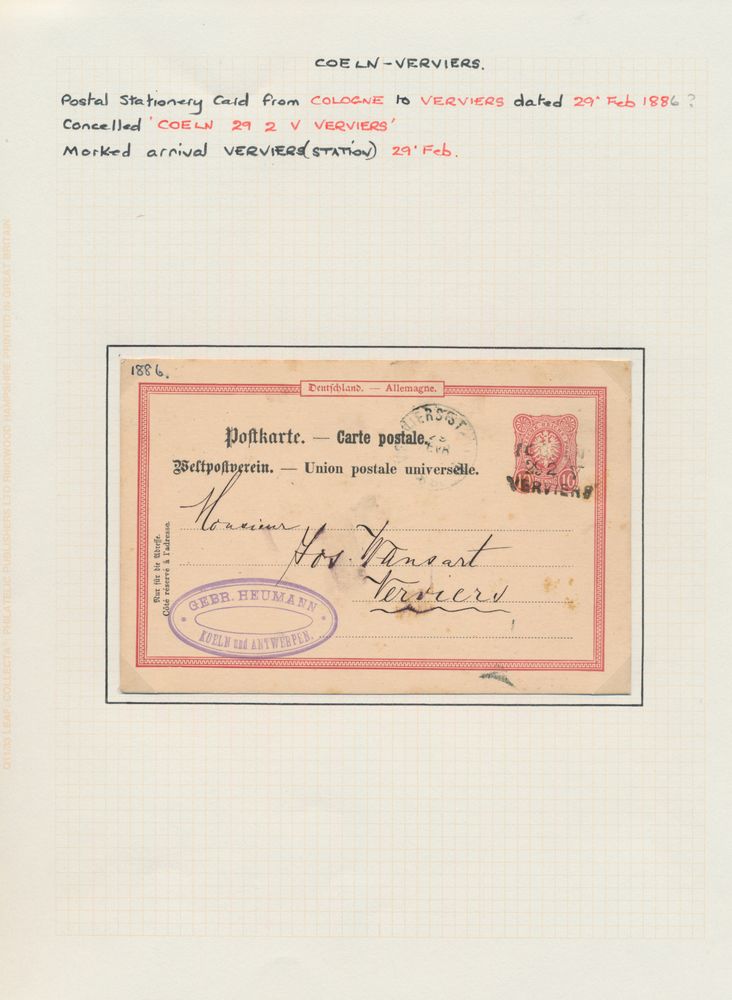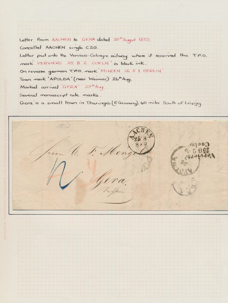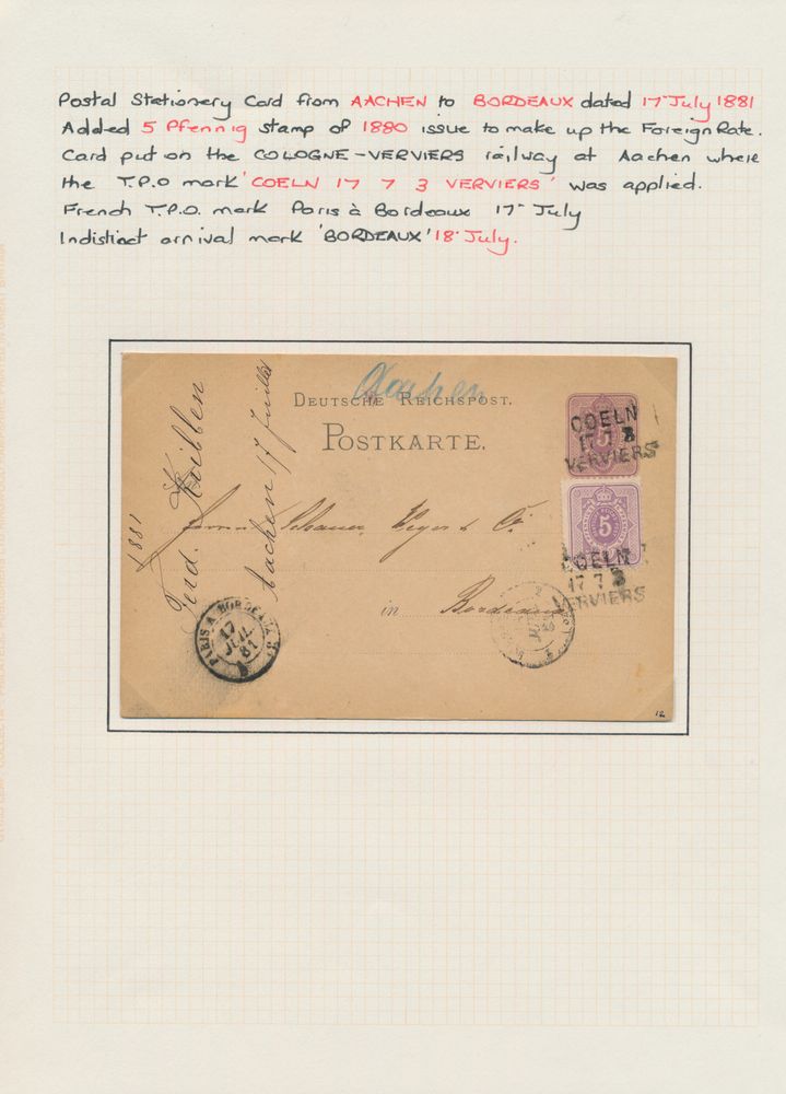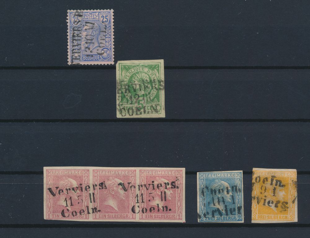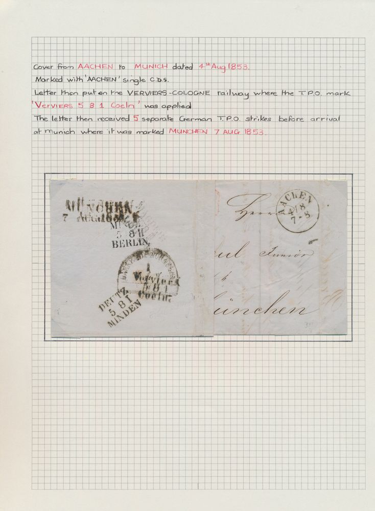 2635 0 imageNice collection concerning railway Cologne-Verviers (Cologne-Verviers) cancelled in 3 lines "Verviers / date / Coeln" or " Coln(Rhein) / date / Verviers". 6 stamps (Germany, Belgium and Haiti) including strip of 3 (Germany). 19 documents (letters and stationery) from Belgium, Switzerland, Spain (4 ex.), Austria, USA, Russia (2 ex.), Mexico, France (2 ex.) and Germany (6 ex.). Beautiful documents with multiple postmarks and different destinations, vf(Image 1) (Image 2) (Image 3) (Image 4) (Image 5) (Image 6) (Image 7) (Image 8) (Image 9) (Image 10) (Image 11) (Image 12) (Image 13) (Image 14) (Image 15) (Image 16) (Image 17) (Image 18) (Image 19) (Image 20)