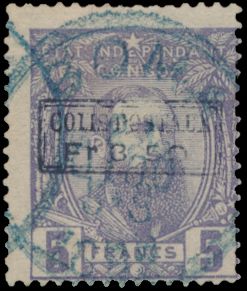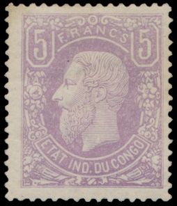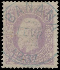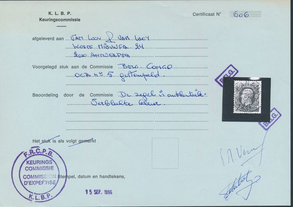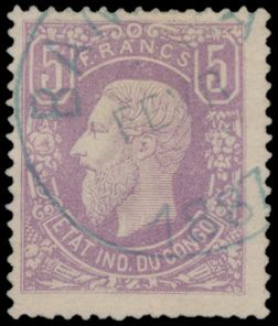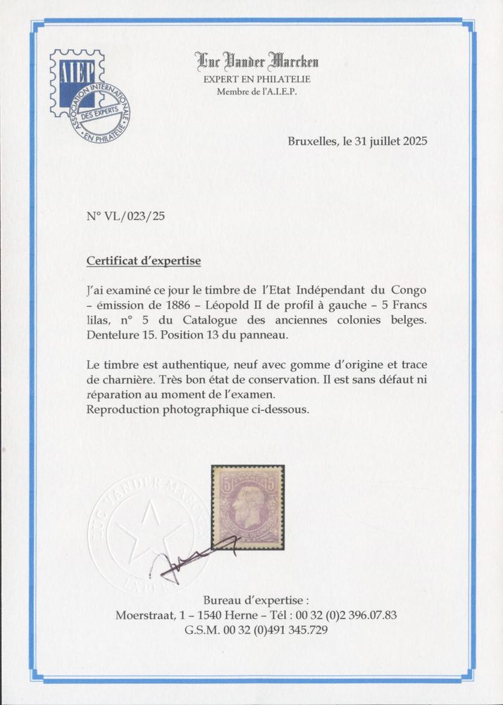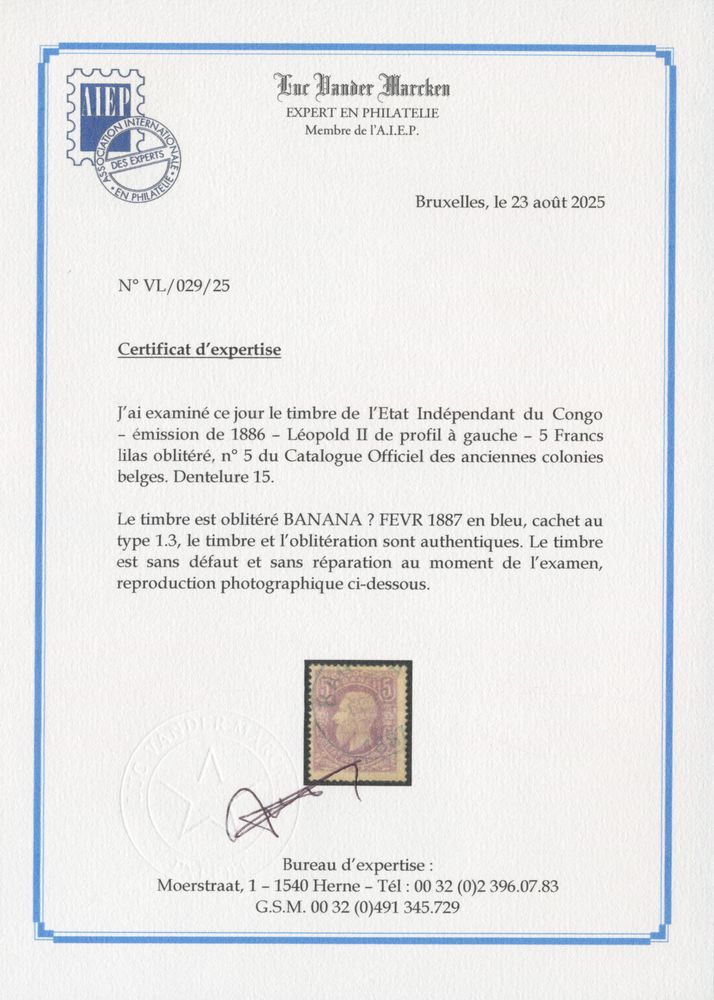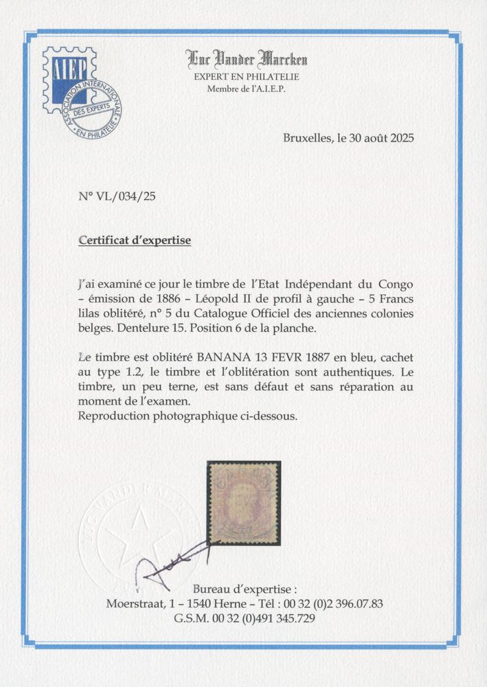 2910 0 imageN° 5 "5fr. lilac", cancelled "BANANA 13 FEB 1887" in blue, position 6 on the plate, well centring, pale colour, certificate Luc Vander Marcken and KLBP, f (OBP €540)(Image 1) (Image 2) (Image 3)