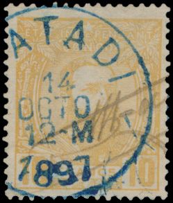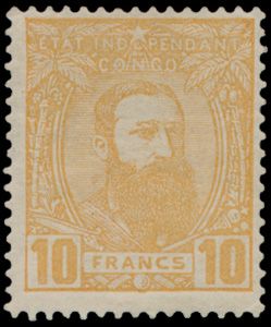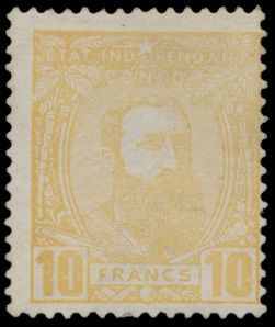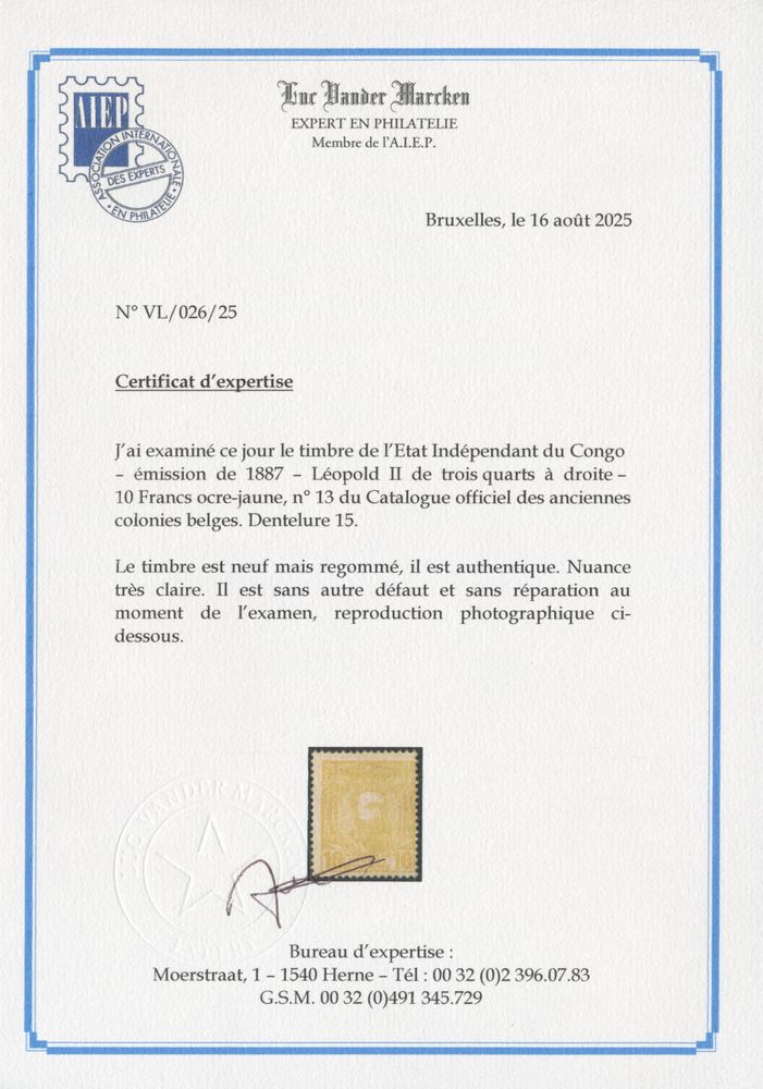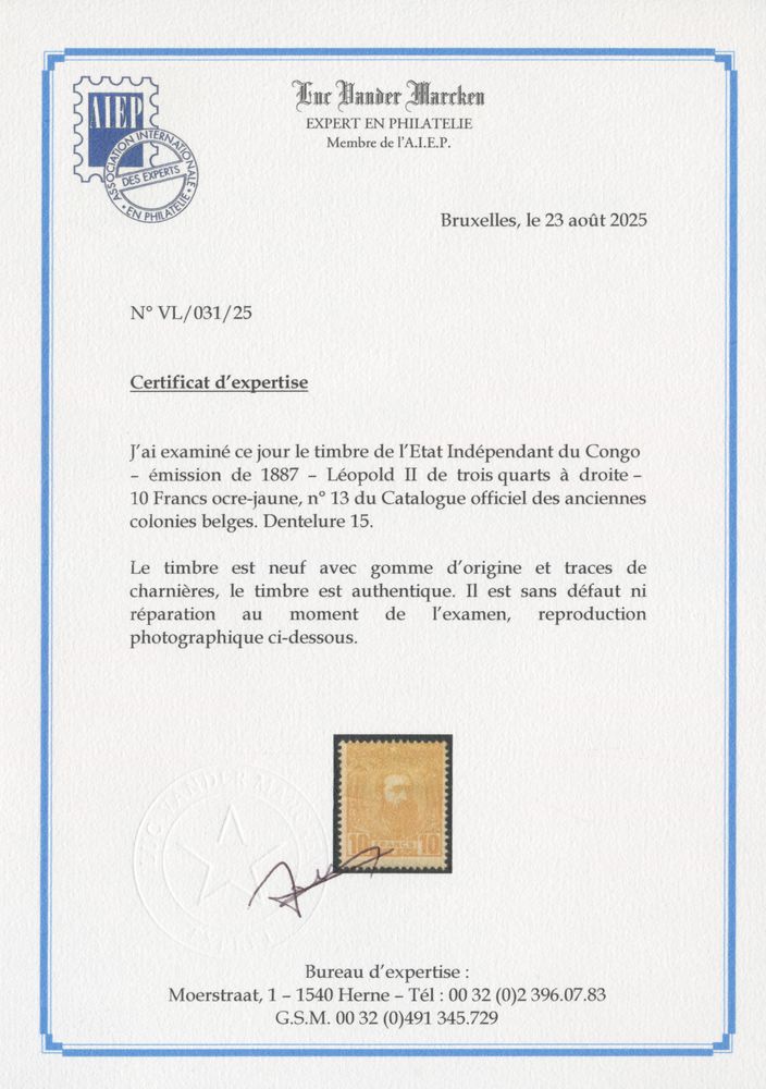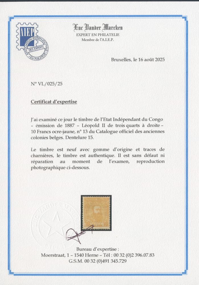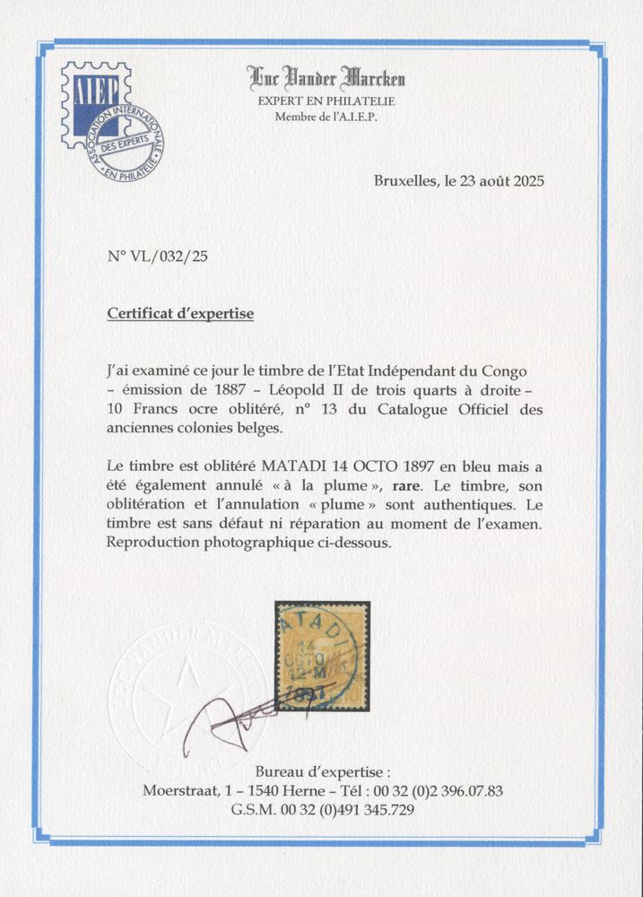 2915 0 imageN° 13 '10 Fr ochre-yellow' cancelled Matadi 14 October 1897 and 'Plume' cancellation RARE, with certificate, vf (OBP €600)(Image 1) (Image 2)