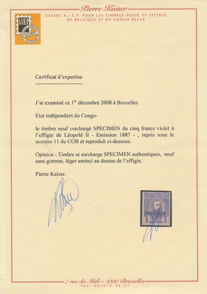 2911 ng imageN° 11 ‘5 fr. violet’ without gum, with Specimen stamp, stamp slightly thin on the back, with Kaiser photo certificate, vf/f(Image 1) (Image 2)