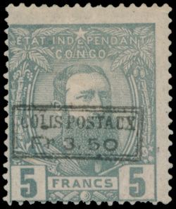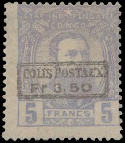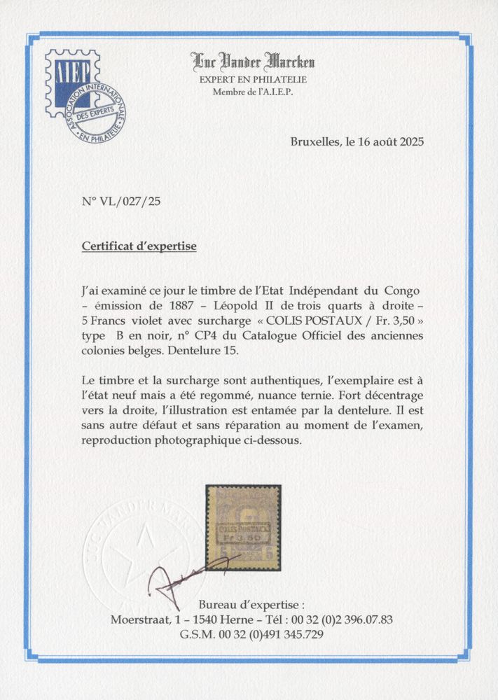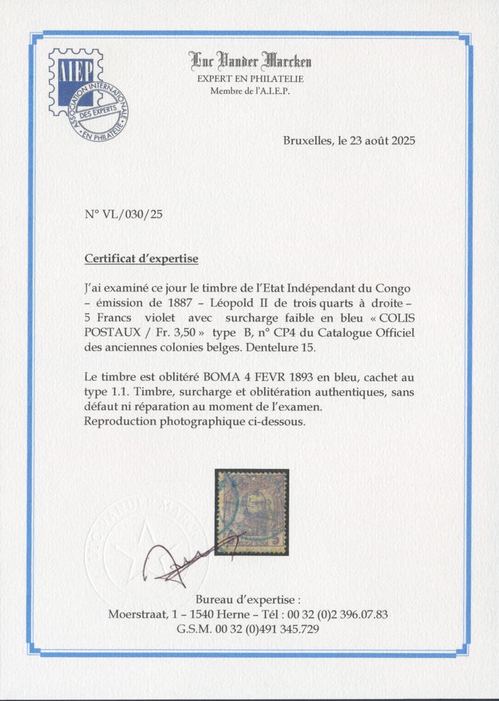 2919 0 imageCP 4 '5 Fr purple' with in box overprint 'Colis postaux Fr 3.50' blue cancelled from Boma 4 February 1893, with certificate, vf (OBP €950)(Image 1) (Image 2)