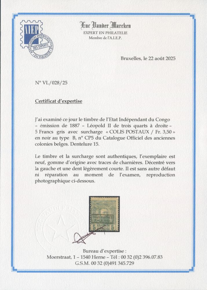 2920 og imageCP 5 "5fr. gray” with in box overprint "COLIS POSTAUX FR. 3.50" in black, certificate Luc Vander Marcken, f(Image 1) (Image 2)