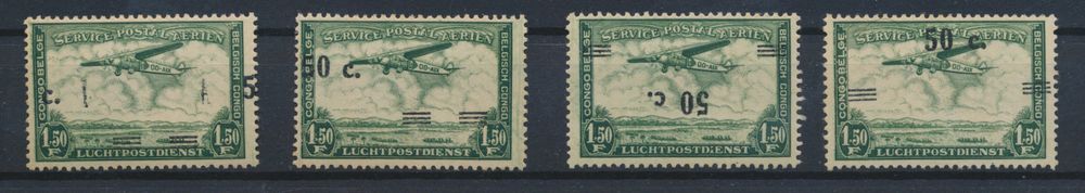 2965 og imageGroup of 4 stamps of OBP n° PA16-Cu "50c on 1,50fr - Airmail Stamps 1936 issue", all with curiosity of surcharge: (1x) inverted, (1x) misplaced upwards, (2x) "A CHEVAL", mint and hinged, some rust, but very scarce, vf/f/to be checked(Image 1)