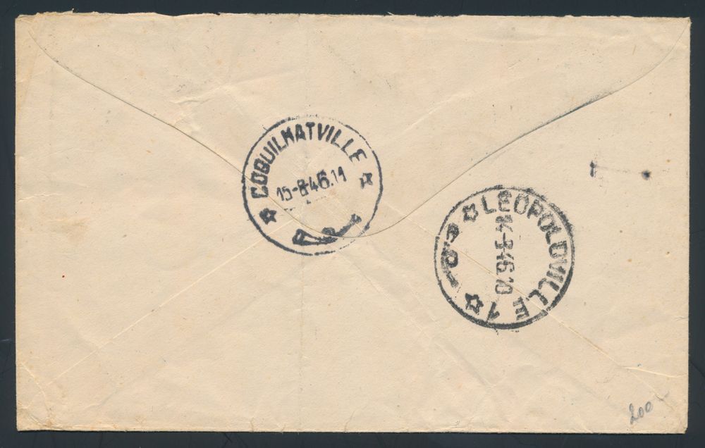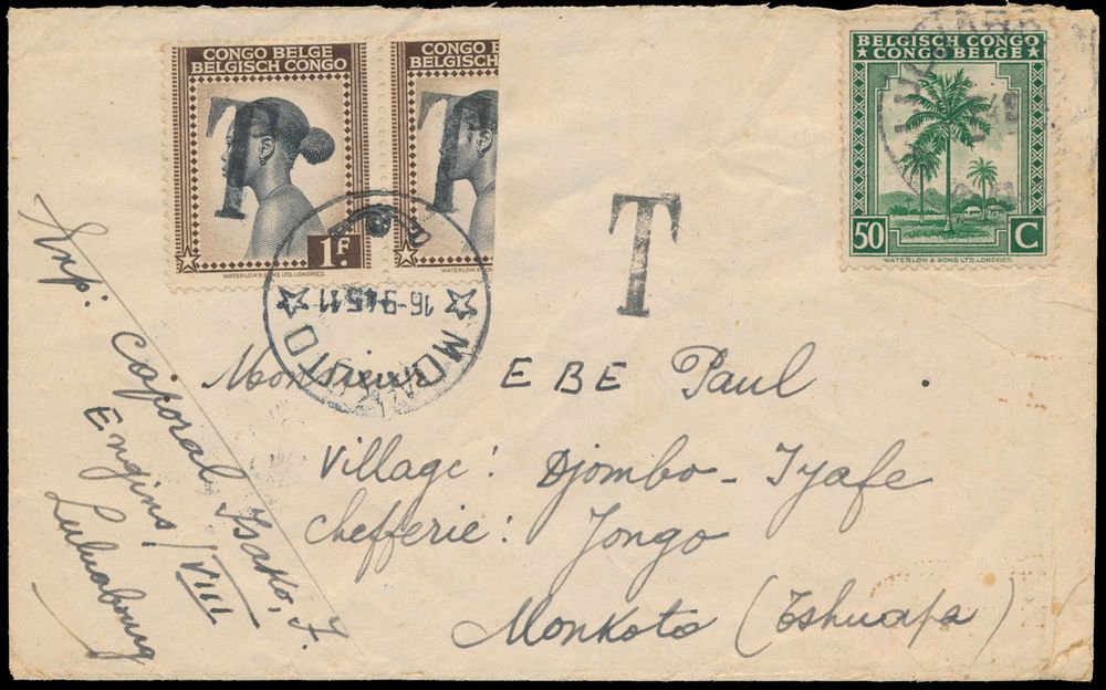 2967 image1946 letter franked at 50c with N° 234 from Luluabourg 9/7/46 to Monkoto, on the back transit mark Leopoldville 14/08/46 and Coquilhatville 15/08/46, rate valued at 1.50 Fr in Monkoto with a half stamp at 1 Fr (N° 257) - rare, vf(Image 1) (Image 2)