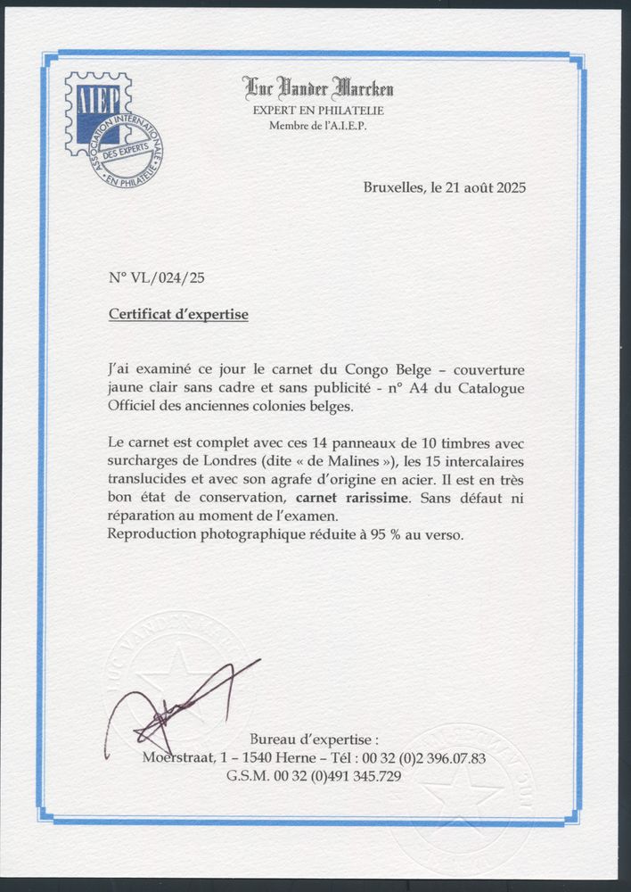2966 nh imageComplete A4 booklet from 1922 with 14 stamp panels and 15 dividers, original staple and excellent condition, extremely rare, with Luc Vander Marcken certificate, vf (OBP €7,500) - see cover photo(Image 1) (Image 2)