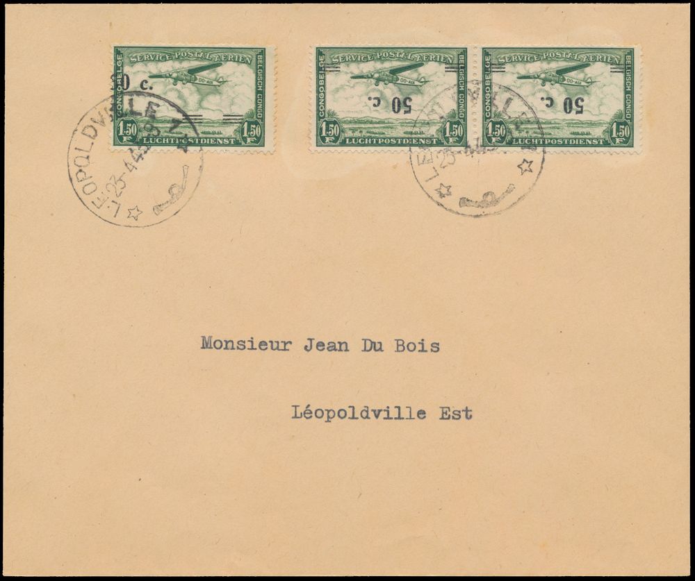2964 image1943, cover franked with OBP PA16-Cu (horizontal pair + single) "50c on 1,50fr Airmail Stamps 1936 issue", the single stamp with misplaced surcharge "A CHEVAL" and the pair with inverted surcharge, sent from Leopoldville-1 April 23, 1943 to Leopoldville Est, amazing cover, very impressive and scarce usage of curiosities of surcharge, vf(Image 1)
