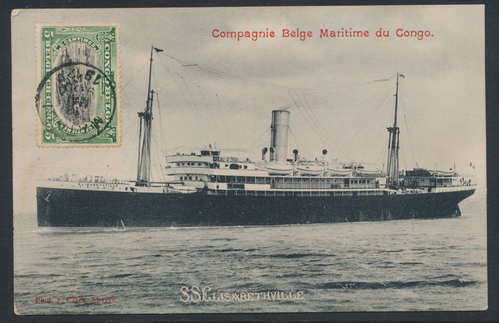 3039 ZK imageN° 54 "5c. green" on illustrated postcard of the "SS Elisabethville" written on board in Matadi on arrival of the 8th connection of the Paquebot, the card signed by the 1st petty officer is franked at the printed matter charge and sent on 13 May 1912 to Assche in Belgium, vf(Image 1) (Image 2)