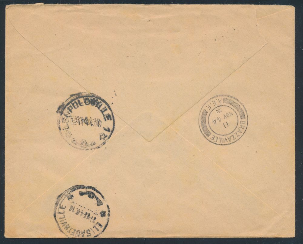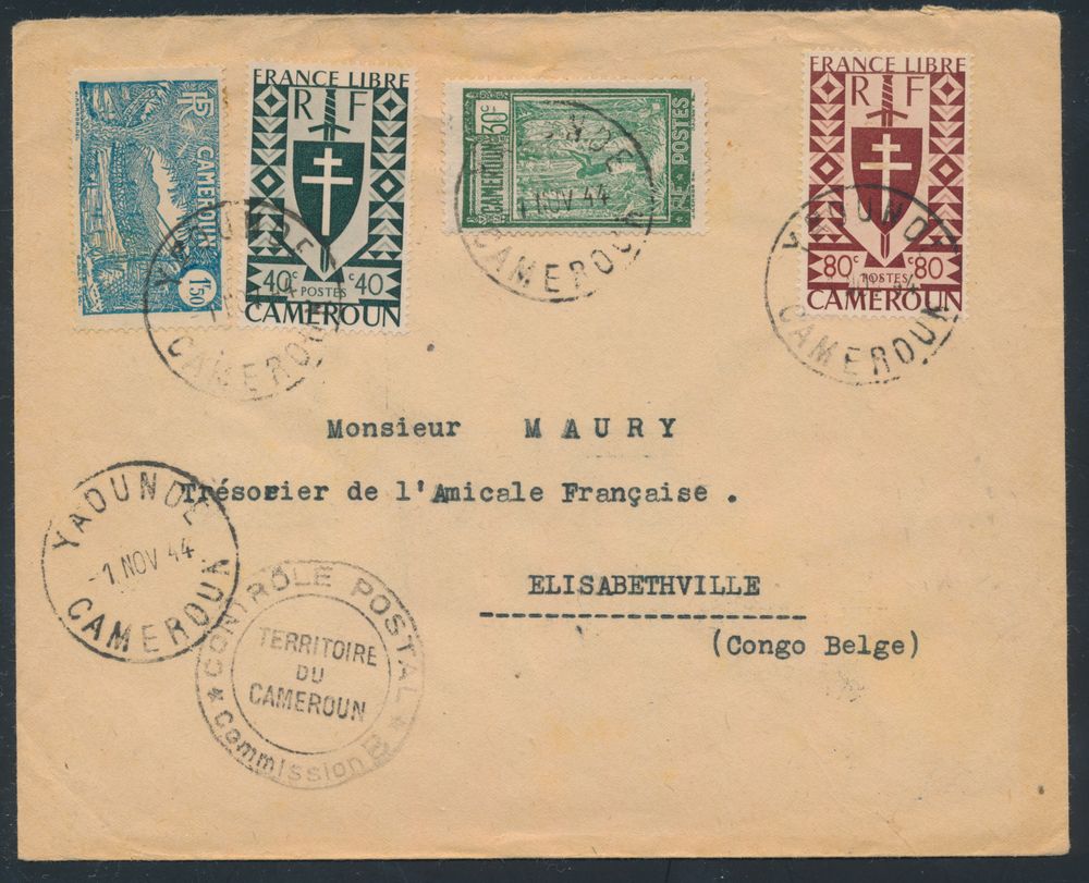3021 image1944 Cameroon, N° 128, 136, 253 and 254 on letter from Yaoundé on 14 November 1944 to Belgian Congo, censorship mark "Controle postale/terrritoire de Cameroun/Commission B", transited Brazzaville on 11 November 1944, Leopoldville on 12 November 1944 and arrived in Elisabethville on 17 November 1944, vf(Image 1) (Image 2)