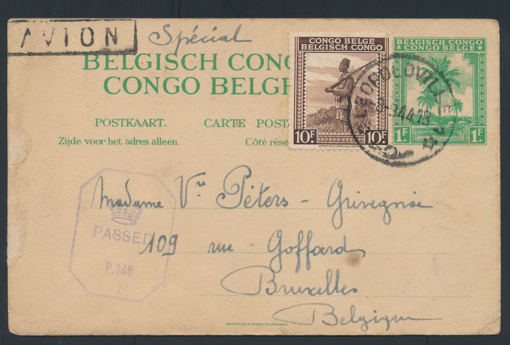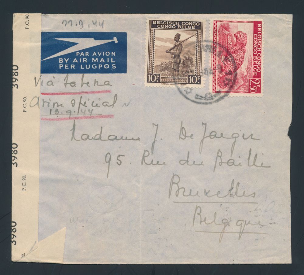 3026 ZK image1944 EP Stibbe N° 74V at "1fr." with additional postage of a "10fr." stamp N° 266 sent from Leopoldville on 3-9-44 to Brussels, British censorship mark "PASSED O.148" with crown struck in blue, annotation "AVION SPECIAL", vf(Image 1) (Image 2)