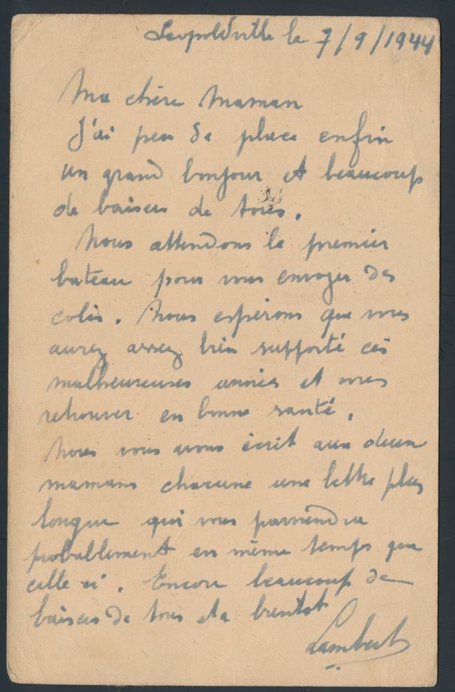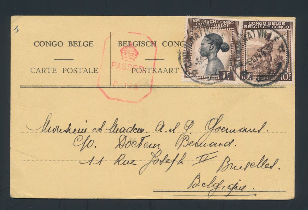 3031 ZK image1944 Postcard franked at "11fr." with N° 237 and 266 sent on 6-10-44 from Coquithatville to Brussels, British censorship mark "PASSED P.126" with crown struck in red, vf(Image 1) (Image 2)