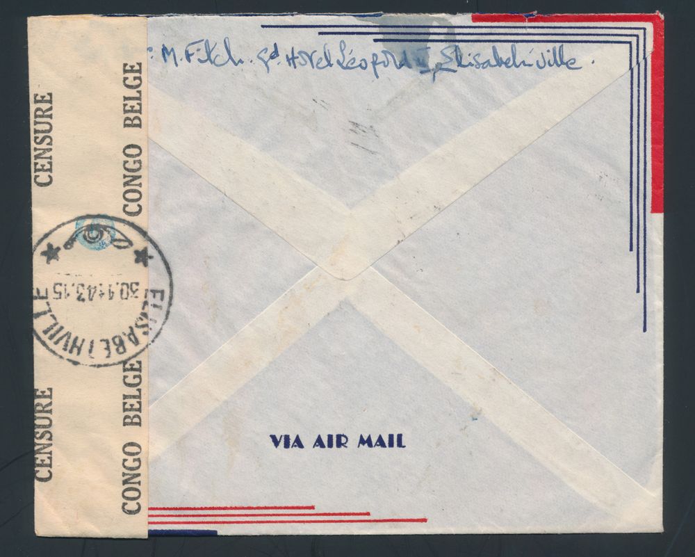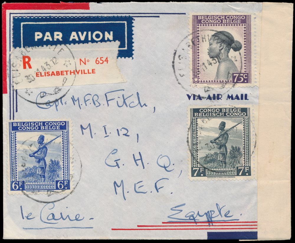 3035 image1943, cover franked with 75c, 6fr and 7fr - Palms 1942 issue, sent in registered from Elisabethville Nov. 30, 1943 to Capt. Fitch in G.H.Q. M.E.F. in Egypt (Fitch was member of the British military Mac Kenzie mission to take stock of the strength of the colonies in Africa), with civilian censor tape "CENSURE CONGO BELGE" (type Aa) + censor number "6" in blue applied at Elisabethville (Nov. 30), vf(Image 1) (Image 2)