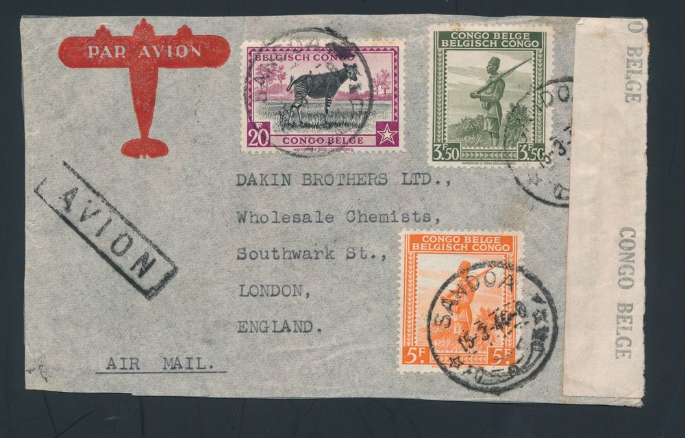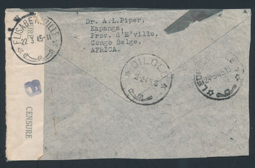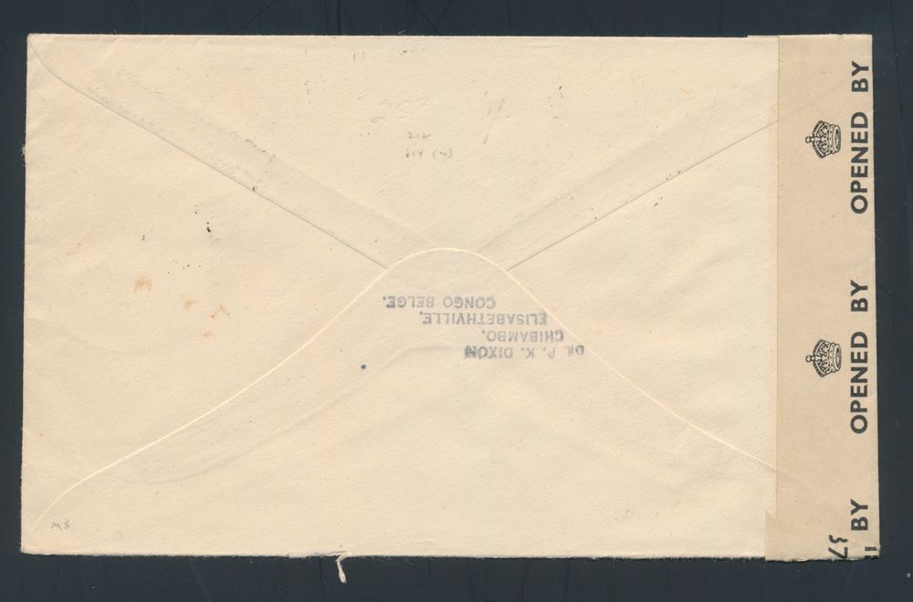 3024 image1945 Airmail letter franked with N° 246, 262 and 263 sent from Sandoa on 15-3-45 to Great Britain, Congo wrapper type Aa and censor's stamp "8", affixed in Elisabethville on 22-3-45, transit Dilolo and Leopoldville, vf(Image 1) (Image 2)