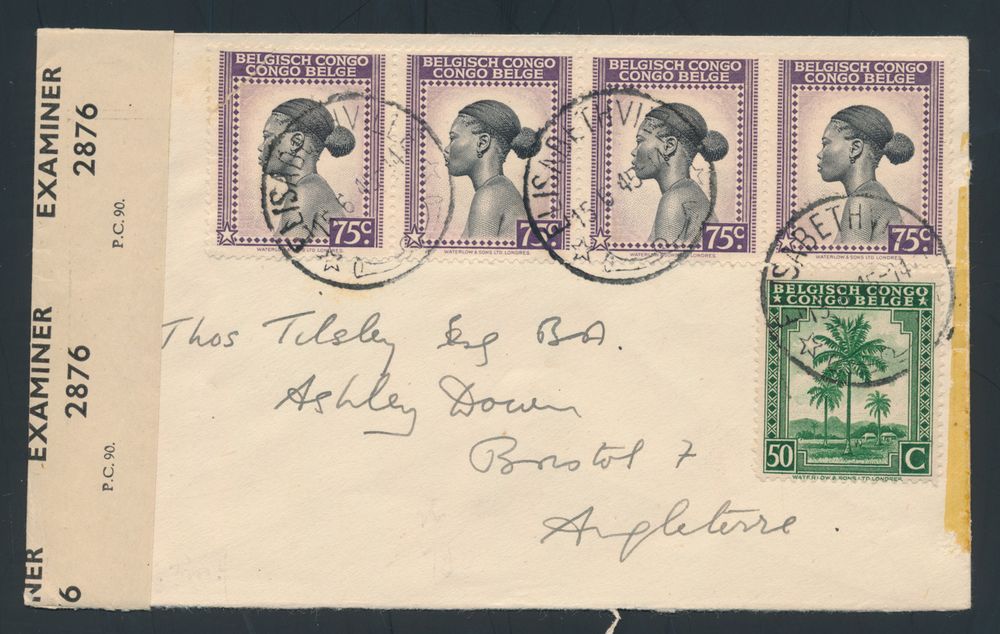 3034 image1945 Letter franked with N° 234 and N° 256 (wrapper of 4) sent from Elisabethville on 15-6-45 to Great Britain, British censorship wrapper, examine 2876/P.C. 90, vf(Image 1) (Image 2)
