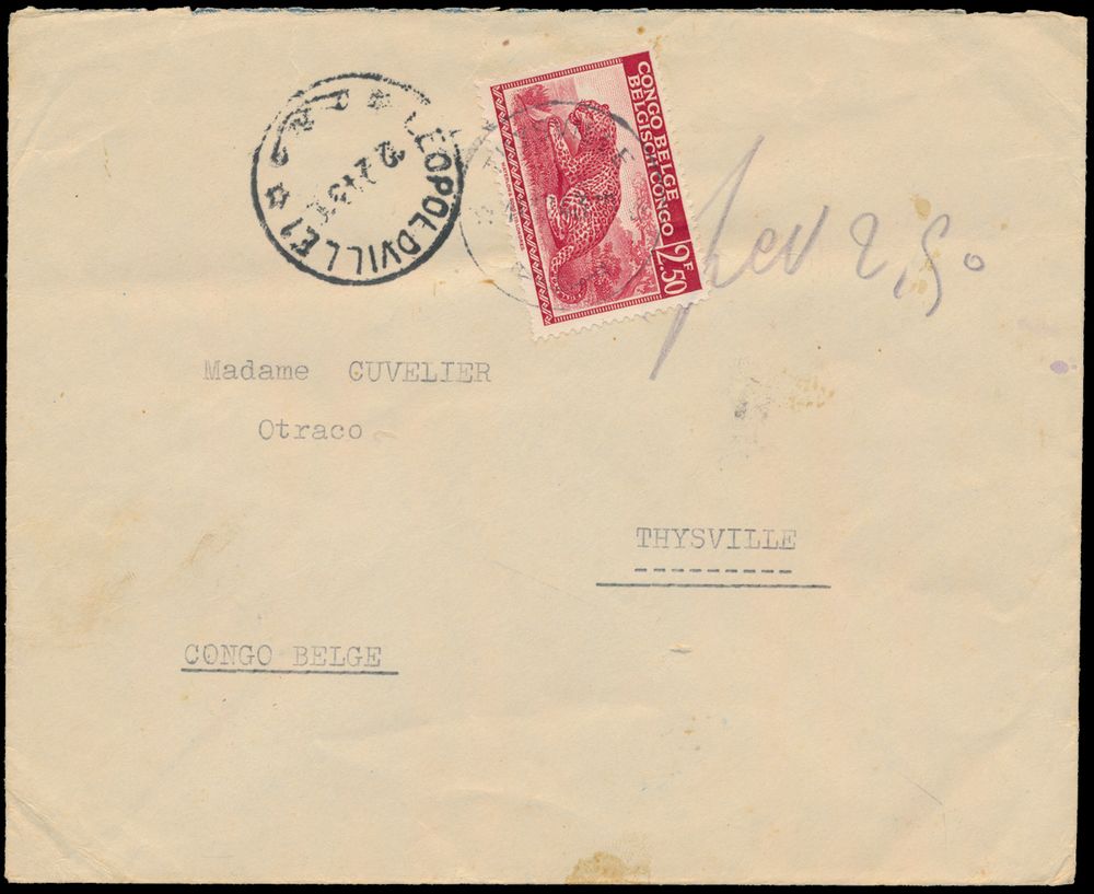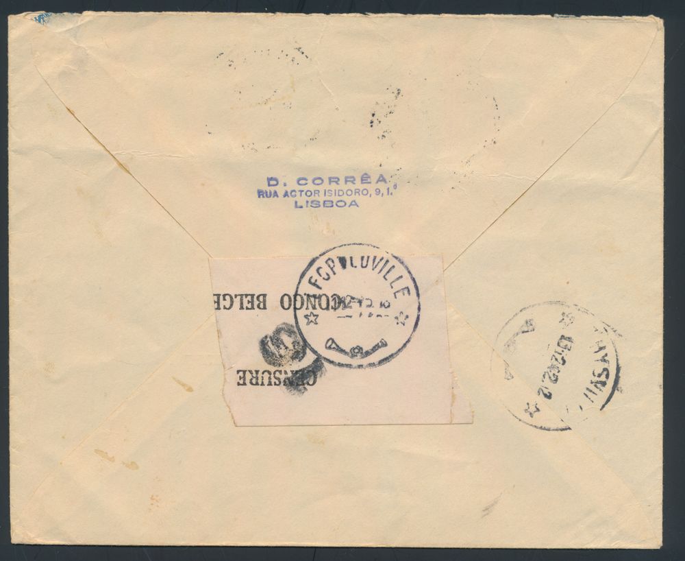 3027 image1942, cover sent under cover from (Portugal), to Thysville in Belgian Congo, transit via Leopoldville where the handwritten "PCV 2,50" (Payé Contre Valeur) in pencil was applied, paid at arrival Dec. 14, 1942 in Thysville with a 2,50fr red - (Leopard) Palms 1942 issue, rate of December 1, 1940 for domestic cover at 2,50fr for first 10gr, with (on reverse) censor tape "CENSURE CONGO BELGE" type Aa + censor number "16" applied at Leopoldville (Dec. 11), under covers are scarce, very attractive cover for this topic, vf(Image 1) (Image 2)