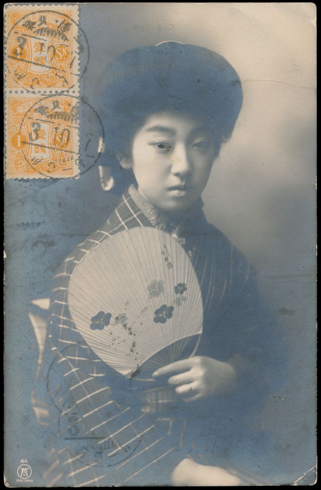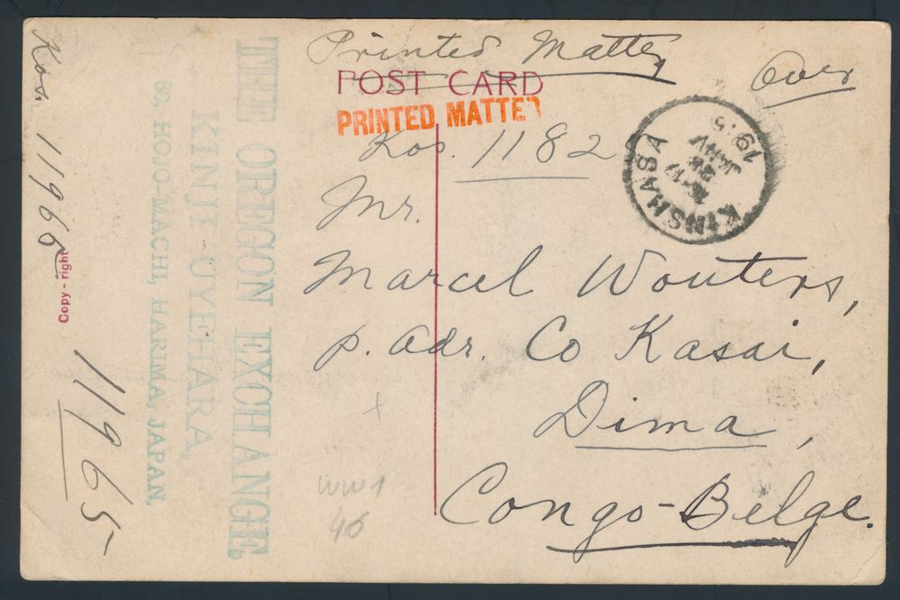 3022 image1915, Japan, picture postcard franked at 2sn (Y&T 118 vertical pair), sent as printed matter from Harima October 3, 1915 to Dima in Belgian Congo, via Kinshasa (Jan. 28), uncensored, very scarce incoming mail, very uncommon, superb, vf(Image 1) (Image 2)