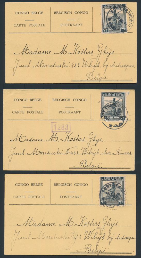 3038 image1945 Lot of 3 postcards franked at "7fr." with a N° 265 stamp, sent from Port-Francqui to Wilrijk, the sender is the pilot of the dredger "LUTSHWADI" (name of a tributary of the Kasai River), f(Image 1)