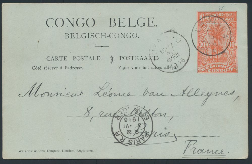 3023 PWST image1916, postal stationery Stibbe #45, sent from Kabinda April 15, 1916 to Paris / France where it arrived June 3, 1916 via Lusambo April 20, vf(Image 1) (Image 2)