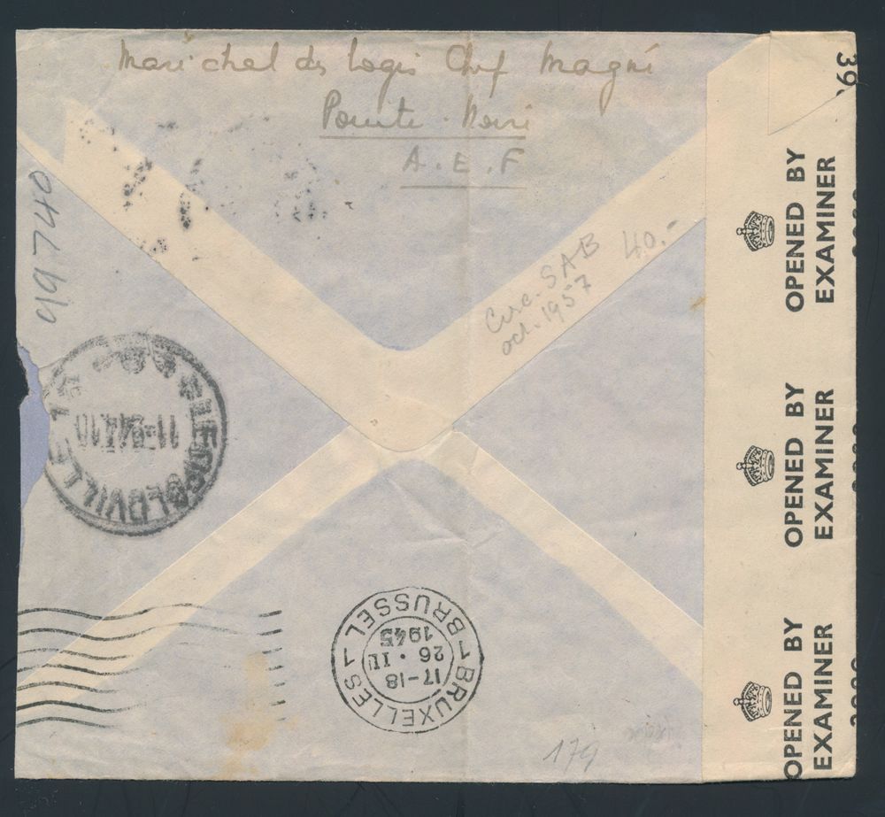 3032 image1944 letter franked at "12.50fr." by N° 241 and N° 245, sent from Leopoldville on 11-9-44 to Brussels, handwritten annotation "VIA SABENA AVION SPECIAL 13-9-44", during this first flight after the liberation of Brussels, only official mail was carried; private mail was diverted to Great Britain for censorship and did not reach Belgium until early 1945, here on 26 February 1945, vf(Image 1) (Image 2)