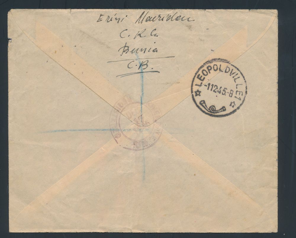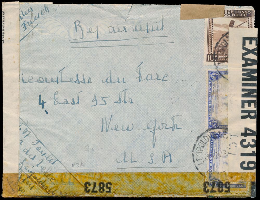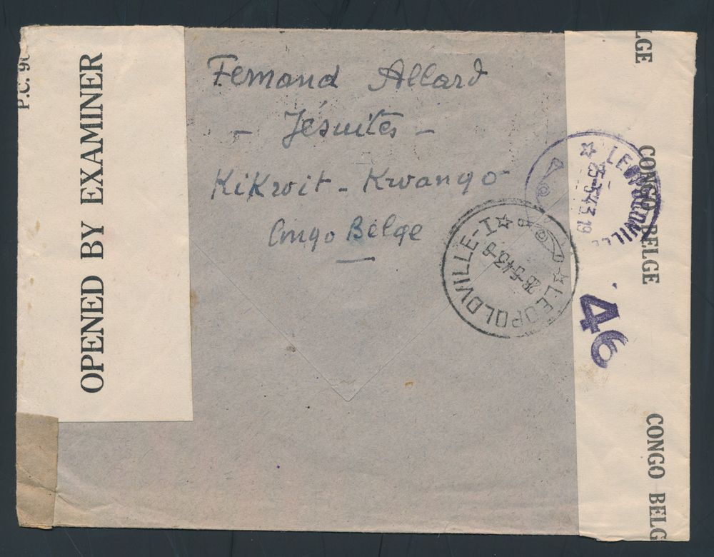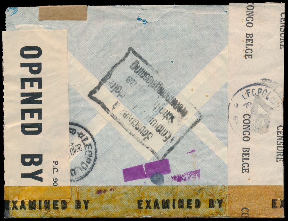 3028 image1943 Letter franked "19fr." by N° 245 and PA 11 (2x) sent from Leopoldville on 20-10-43 to the USA, Belgian Congo censorship wrapper with censor N° "37", British censorship wrapper "open by examiner 4319" and American censorship wrapper "EXAMINED BY 5873", on the back large propaganda in box censorship mark "subscribe to the victory loan", rare combination of 3 censorship stamps and propaganda stamp, vf condition(Image 1) (Image 2)