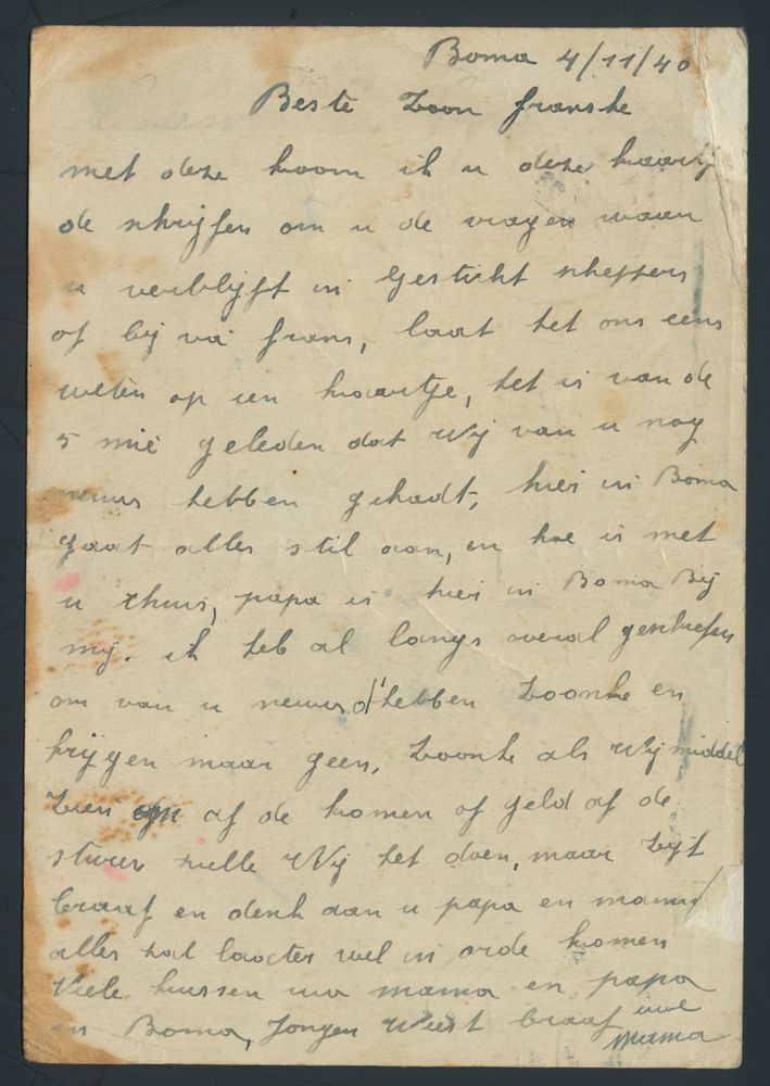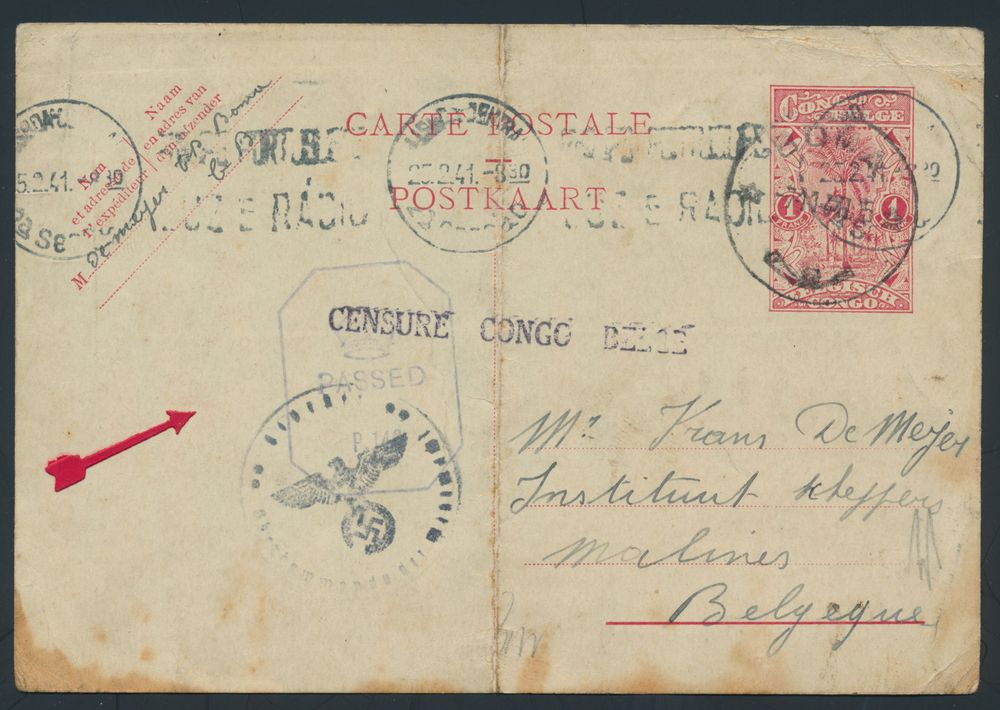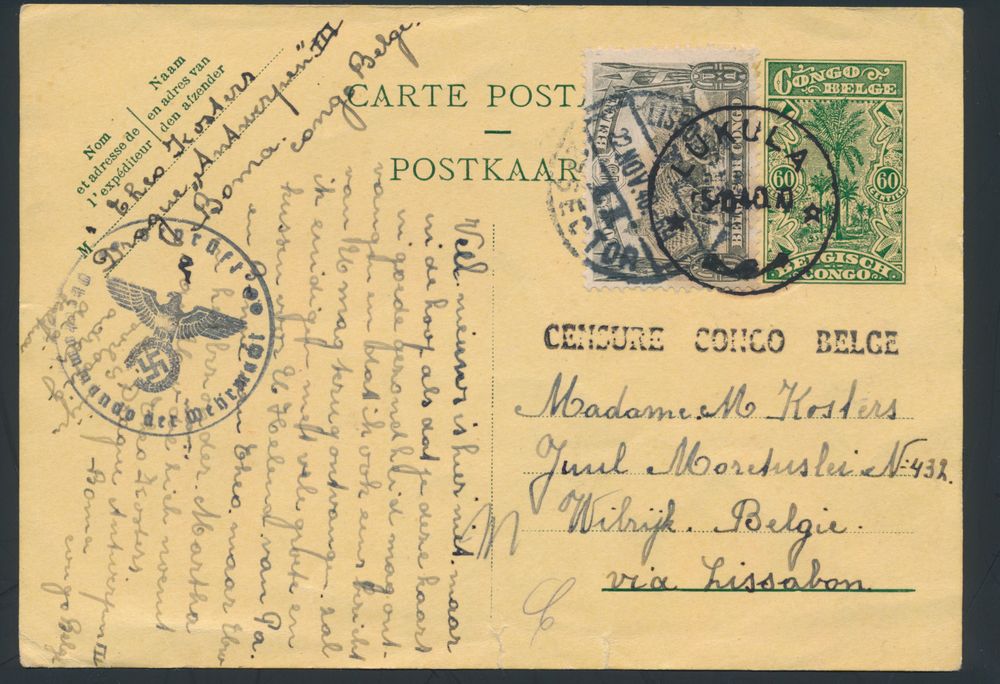 3025 PWS imageEP Stibbe No. 70, from Boma 4 Nov 1940, to Malines, censored in the Congo by the British and Germans, transit mark via Lisbon, rare mail from the Congo arriving in Belgium at that time, rare triple censorship, whole item has a crease, f/to be checked.(Image 1) (Image 2)