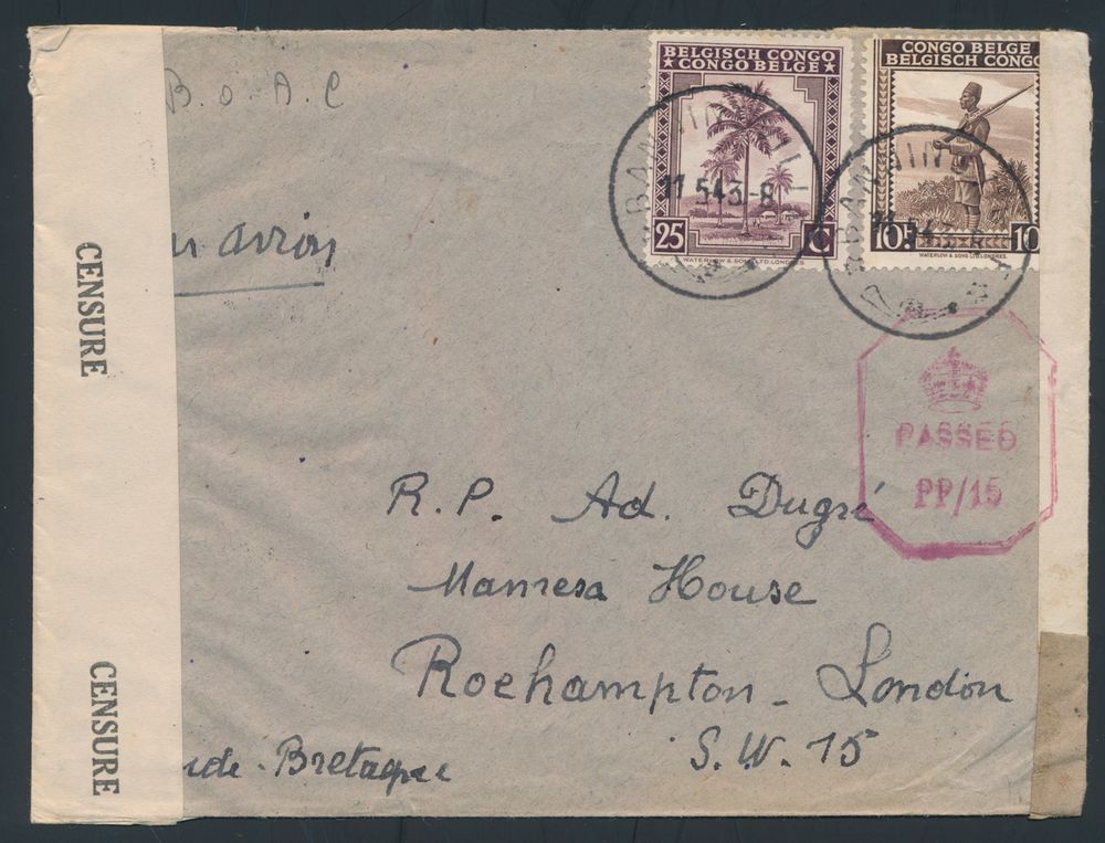 3029 image1943 Letter franked with N° 232 and 266 sent from Banningville on 11-5-43 to London, Congolese censorship wrappers type Aa with censor N° "46" and British censorship covered with red cancellation with crown "PASSED PP/15", correct charge for a letter carried by BOAC, 3.50 + 6.50 BOAC = 10.25fr., vf(Image 1) (Image 2)