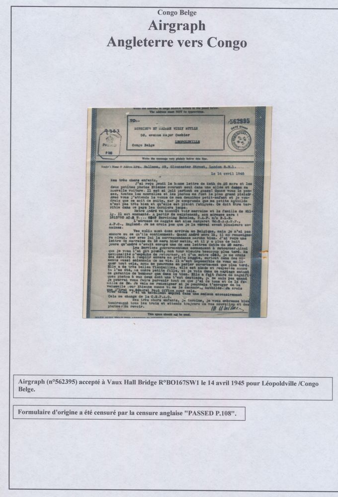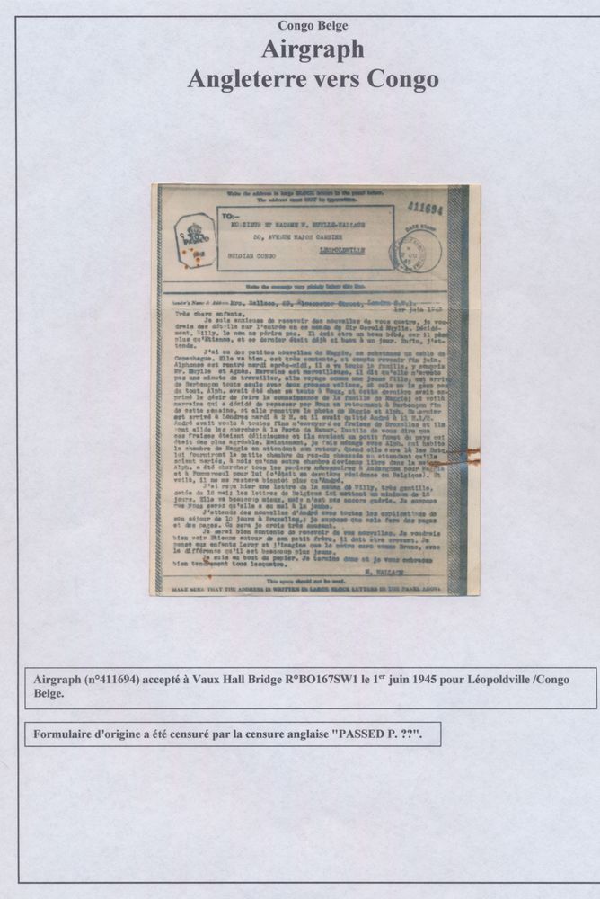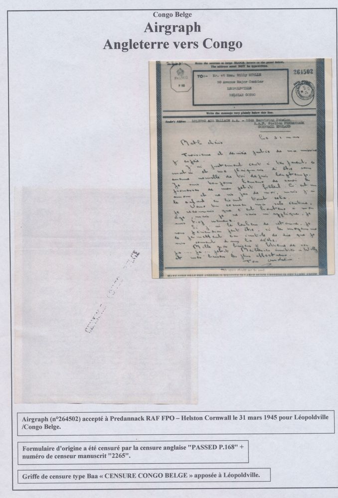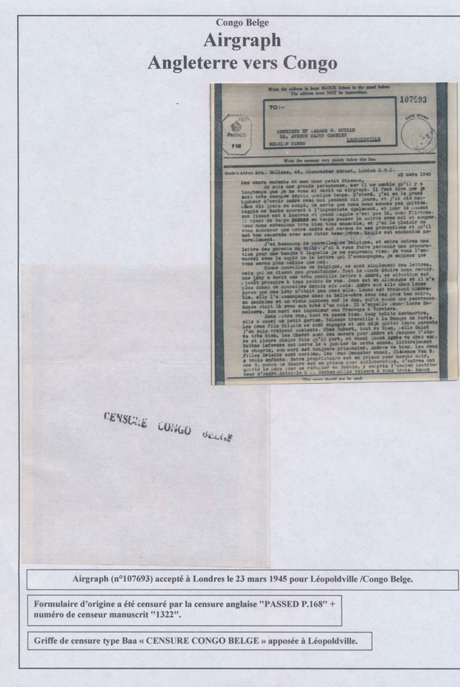 3033 image1945, small accumulation of 4 airgraphs all accepted in UK and sent to Leopoldville in Belgian Congo, with for two of them, Belgian Congo censor on airgraph at arrived with straight-line mark type Baa "CENSURE CONGO BELGE", airgraphs are very scarce to Belgian Congo, vf(Image 1) (Image 2) (Image 3) (Image 4)