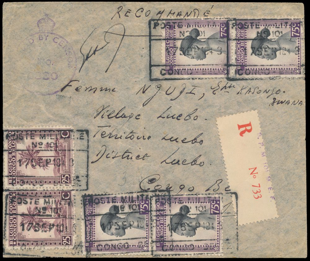 3036 image1943, registered letter franked with N° 232 (2x) and 236 (4x) cancelled stamps, rectangular “Poste Militaire Nr 101” postmark dated 17 September 1943, destination Congo, sent by a soldier of the Force Publique in Egypt, British censorship, fine condition and rare, vf(Image 1) (Image 2)