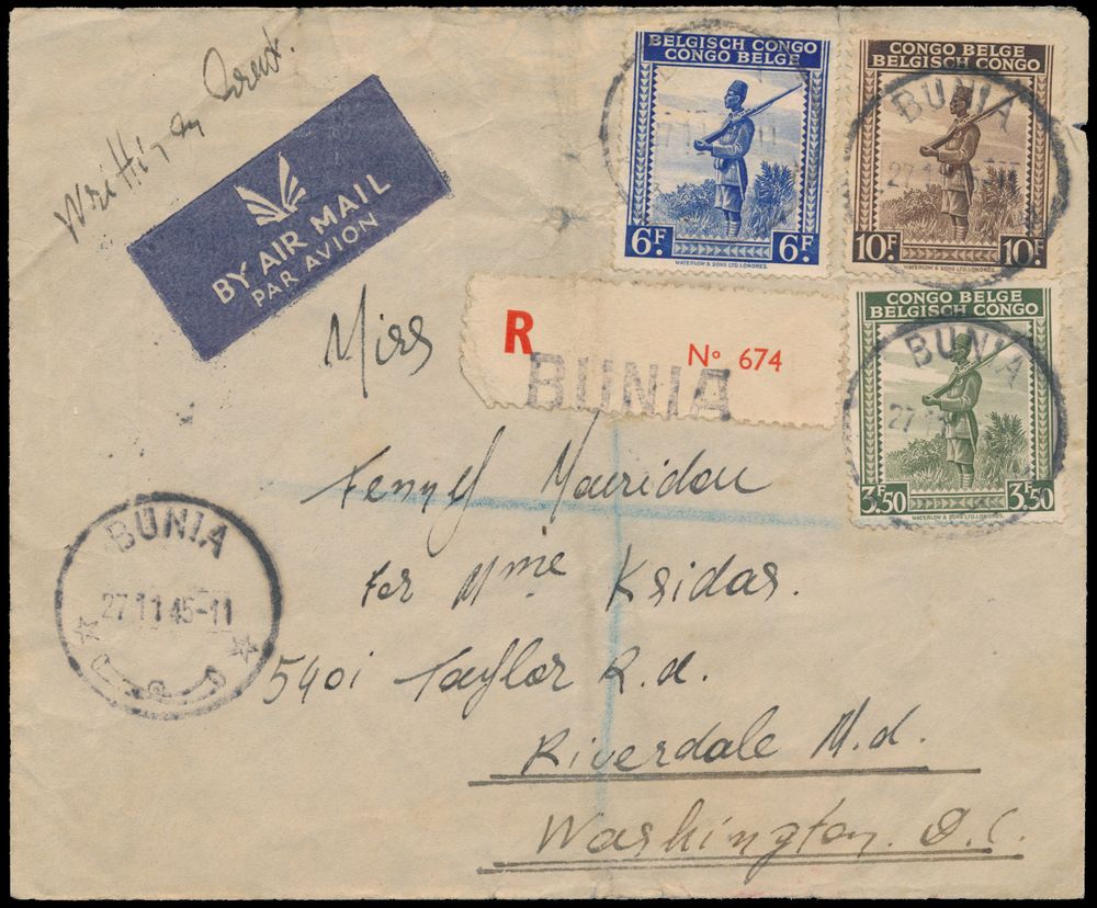 3030 image1944 registered letter franked at "19.50fr." with N° 244, 262 and 266, sent from Bunia on 27-11-45 to the USA, letter from a Greek refugee in the Bunia camp, handwritten annotation "WRITTEN IN GREEK", rare, vf/f(Image 1) (Image 2)