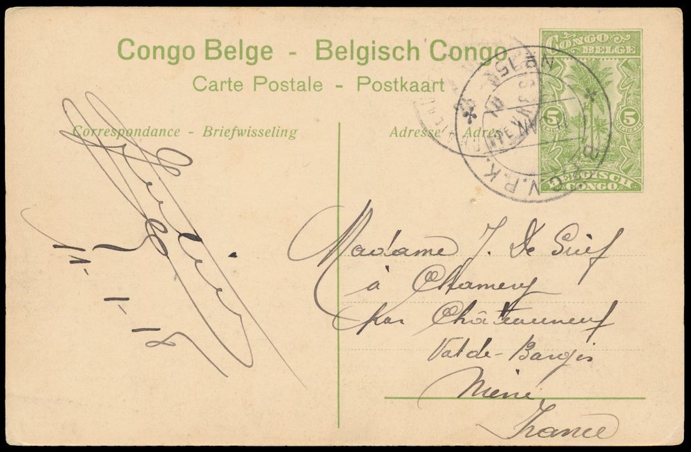 3085 PWST image1918, Belgian Congo postal stationery Stibbe #42 view 45, sent from BPCVPK n°15 (= fieldpost office) January 12, 1918 to Châteauneuf / France where it arrived March 21, 1918, showing clean strike of the BPCVPK n° 15, vf(Image 1) (Image 2)