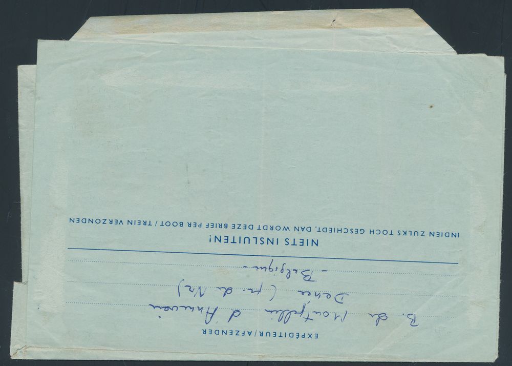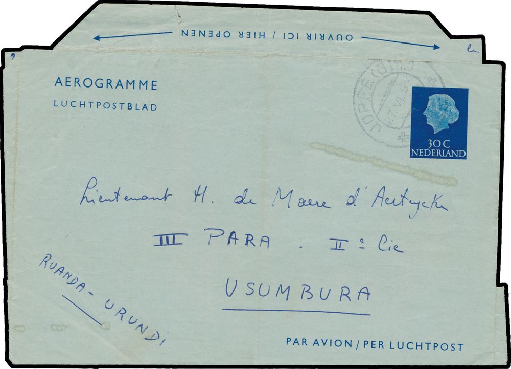 3100 PWST image1960, Netherlands, aerogram sent from Joppe June 27, 1960 to a Belgian lieutenant (member of the Belgian Congo Metropolitan force in Africa) in Usumbura (Ruanda Urundi), folded but incoming mails to the troops are rare(Image 1) (Image 2)