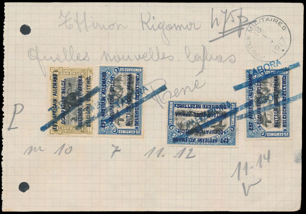 3084 image1917, telegraphic message on part of page of a notebook as "application form", message accepted by POSTES MILITAIRES (small cachet) in Tabora January 18, 1917 to Kigoma, fees of 1,75fr paid with 25c blue (3x) and 1fr olive - Mols bilingual 1915 Belgian Congo issue overprinted EAAOB (large), stamps tied by the TABORA underlined cachet in blue, rare and superb, vf(Image 1)