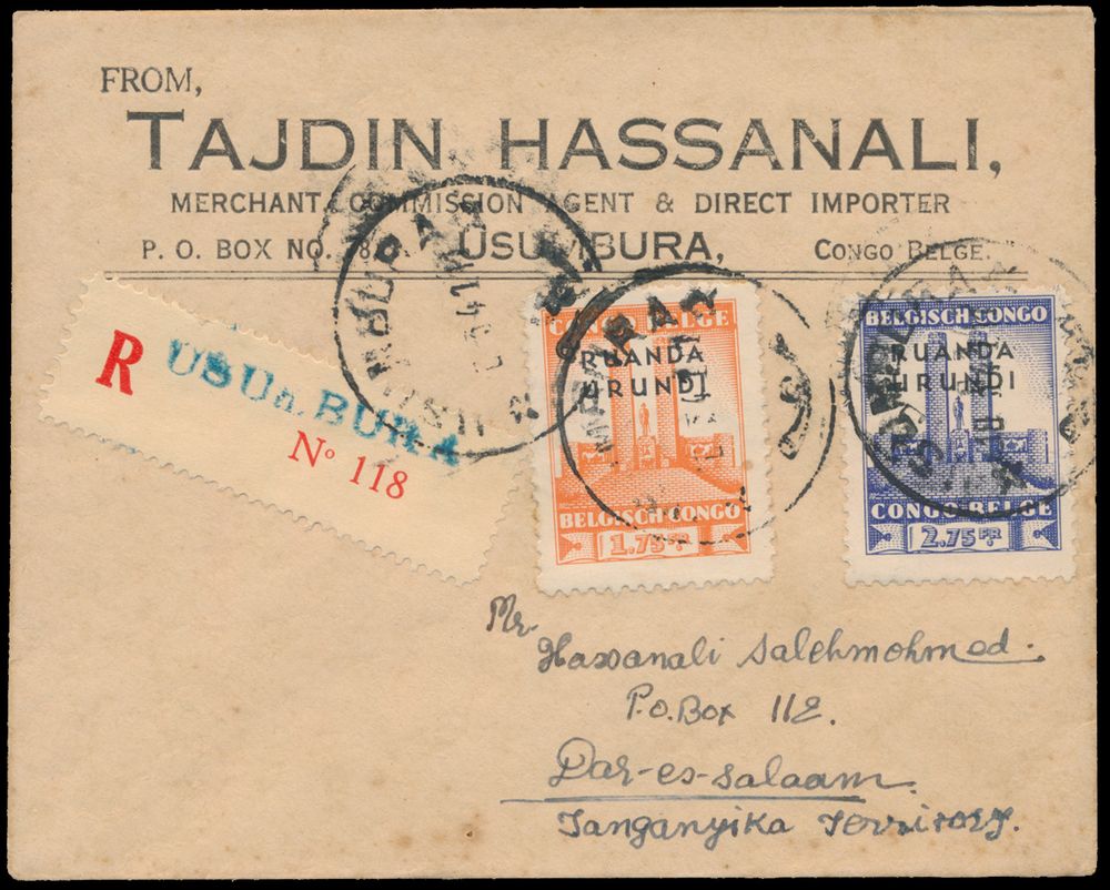 3096 image1941, registered from Usumbura 10 March 1941, franked with N° 122 and 123, destination Dar-Es-Salaam, British censorship on the back, these stamps are rare on cover, vf(Image 1) (Image 2)