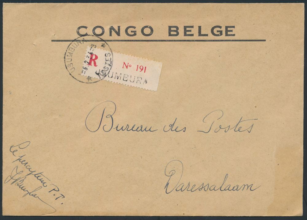 3095 image1934, official mail (envelope) sent in registered from Usumbura February 5, 1934 to the post office of Dar-Es-Salaam / Tanganyika where it arrived February 14, 1934, uncommon official mail between post offices from other countries, vf(Image 1) (Image 2)