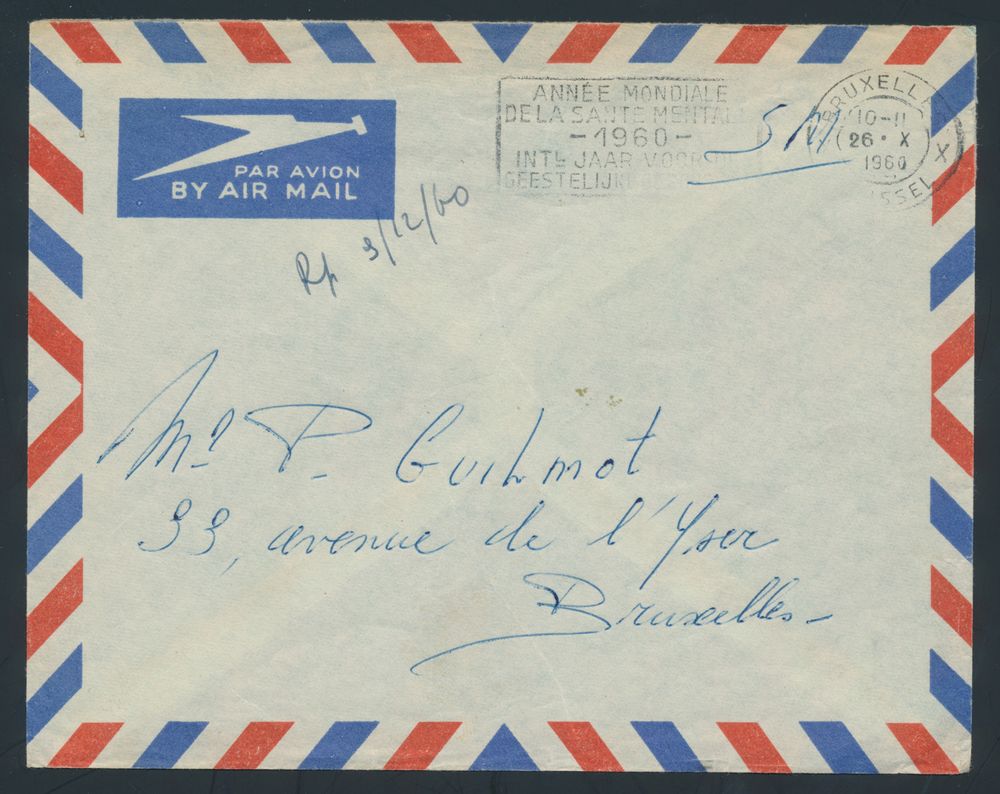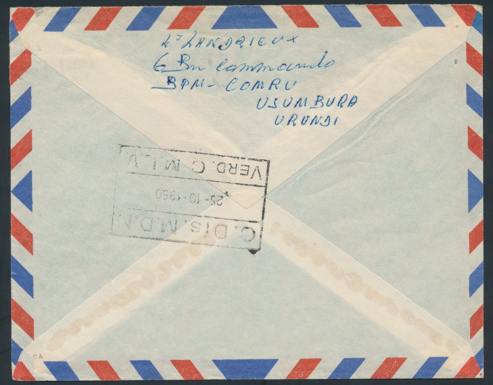 3099 image1960, Belgian Congo Metropolitan force in Africa, airmail envelope, written by a Belgian soldier member of the COMRU - Metropolitan Force of Africa (FMA), sent from Usumbura (datelined on reverse) via military post to Brussels in Belgium where it arrived October 26, 1960, transit cachet C. Dis. M.D.N. Verd. C.M.L.V. (= barrack BAUDOUIN in Brussels) October 25, 1960, vf(Image 1) (Image 2)