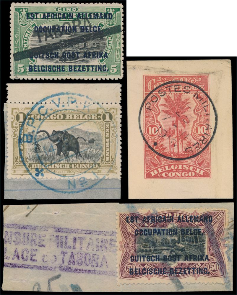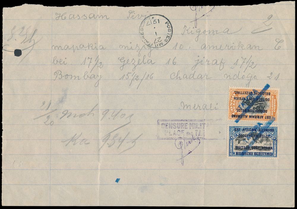 3083 image1917, telegraphic message on part of page of a notebook as "application form", message accepted by POSTES MILITAIRES (small cachet) in Tabora January 27, 1917 to Kigoma, fees of 5,25fr paid with 25c blue and 5fr orange - Mols bilingual 1915 Belgian Congo issue overprinted EAAOB (large for the 25c and short for the 5fr), stamps tied by the TABORA underlined cachet in blue, with Belgian military censor mark in box "CENSURE MILITAIRE PLACE DE TABORA" + signature, scarce usage of the 5fr, definitely a master piece, very rare, superb, vf(Image 1)