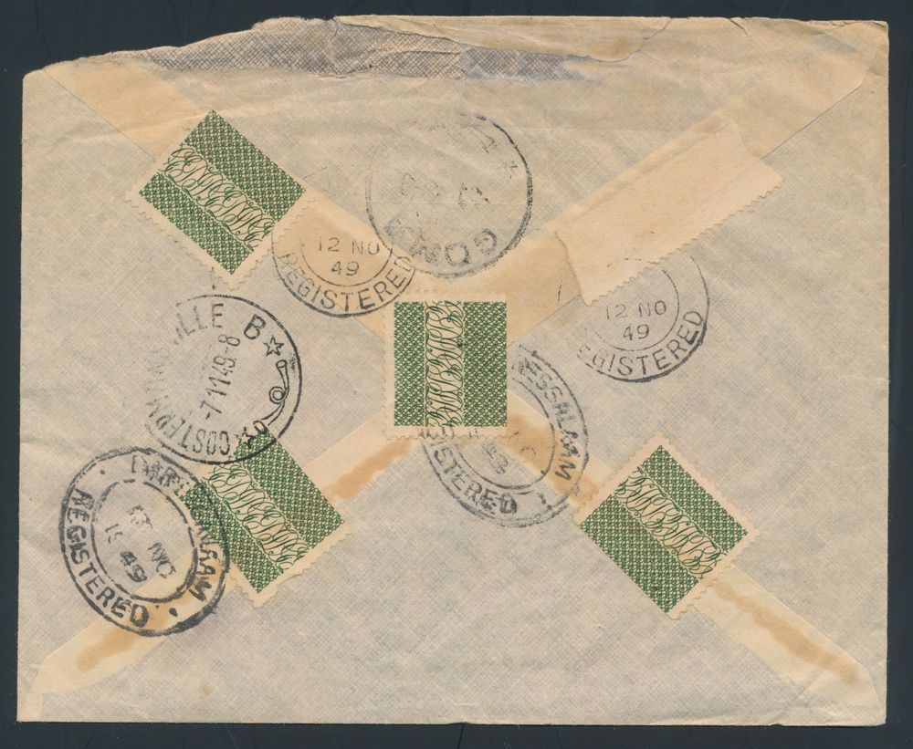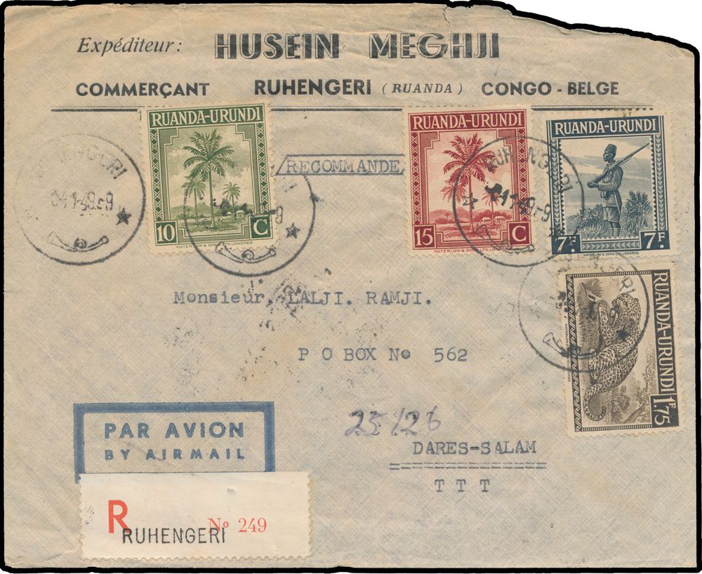 3098 image1949, airmail cover franked with OBP N° 127, 128, 137 and 143 "10c, 15c, 1,75fr and 7fr - Palms 1942 issue", sent in registered from RUHENGERI (Heim & Keach type 8A1) November 3, 1949 to Dar-Es-Salaam / Tanganyika where it arrived November 13, 1949, via Goma and Costermansville, scarce cancellation and uncommon destination, vf/f(Image 1) (Image 2)