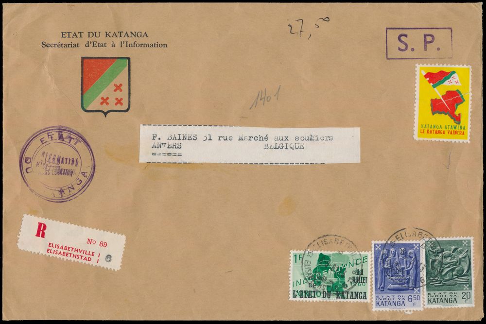 3137 image1961, large cover with Katanga State letterhead, franked with N° 42-60-63, sent by registered mail from Elisabethville on 6-9-63 to Brussels, with 'Katanga Atawina' propaganda pictorial stamp, added a block of 6 'Tshombe' pictorial stamps and a block of 4 Leopold III pictorial stamps, with 'Antwerpen Centrum' station cancelled dated 30-7-1946, vf(Image 1) (Image 2)