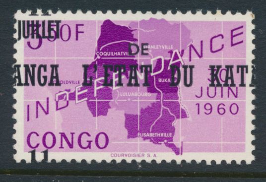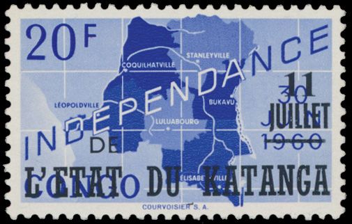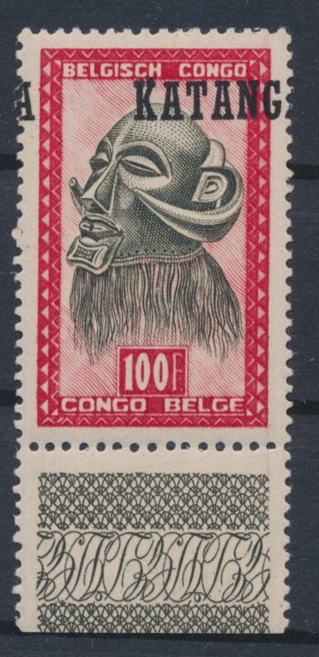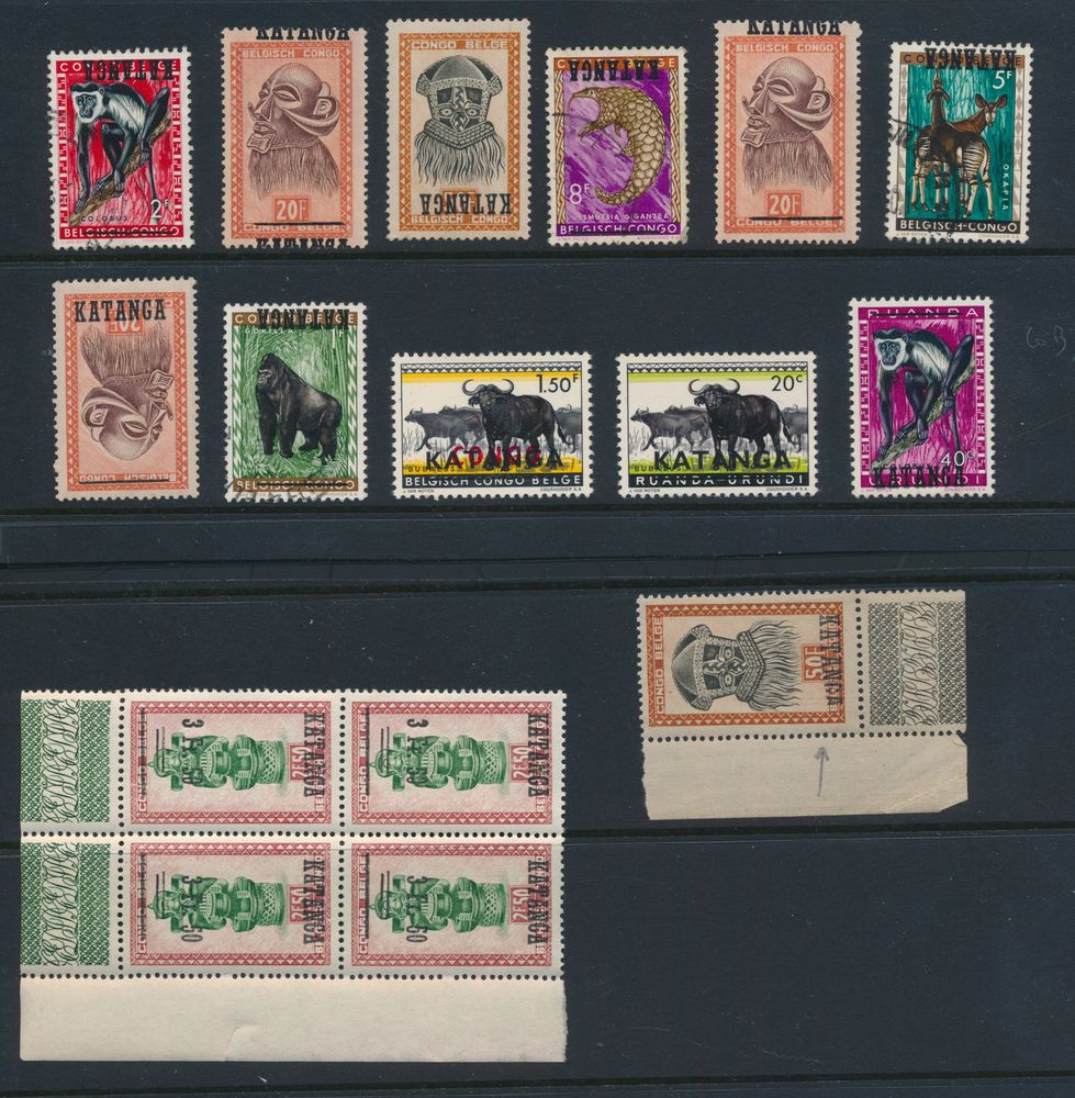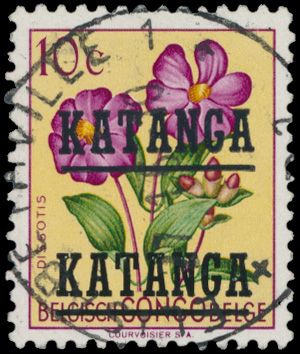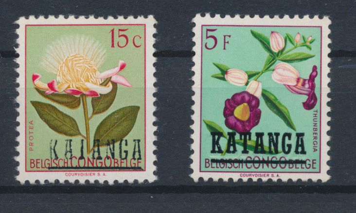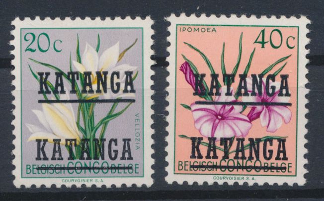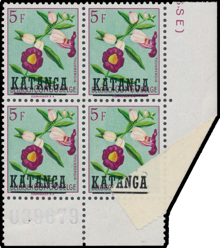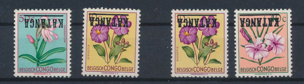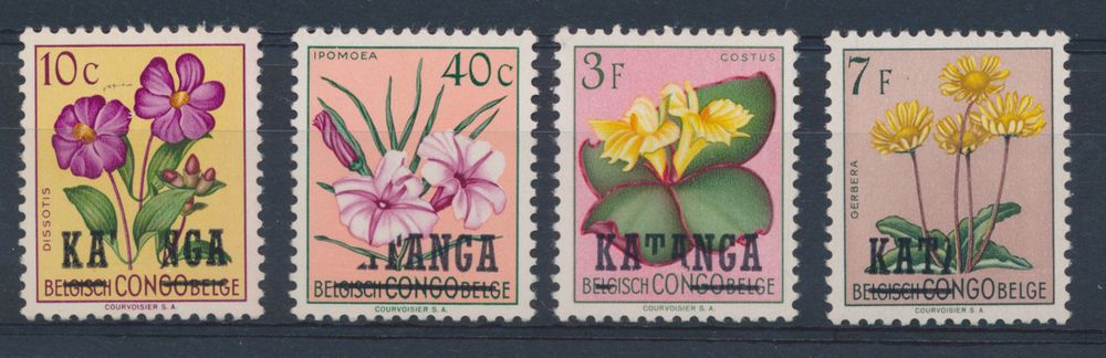 3125 nh imageN° 23-Cu, 27-Cu, 33-Cu and 37-Cu "10c, 40c, 3fr and 7 Fr - Flowers issue" with curiosity of overprint "partial" (word "KATANGA" incomplete), mint MNH, superb and not listed in OBP, scarce, vf(Image 1)
