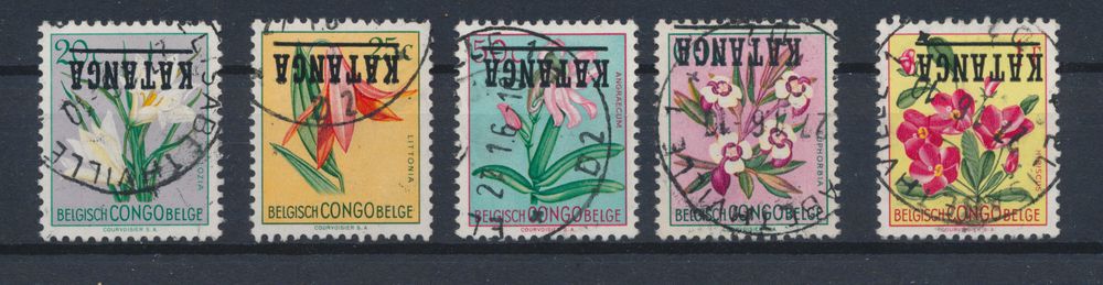 3131 0 imageN° 25-Cu, 26-Cu, 28-Cu, 29-Cu and 31-Cu "10c, 25c, 50c, 60c and 1Fr - Flowers issue", all with inverted overprint and cancelled Elisabethville-1 D2, superb, vf(Image 1)