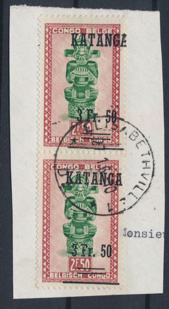 3123 0 imageN° 19-Cu (vertical pair) "3,50fr on 2,50fr - Masks issue" with curiosity of overprint "misplaced and A CHEVAL", on fragment of cover, cancelled Elisabethville-1 D2, not listed in OBP, scarce, vf(Image 1)