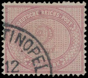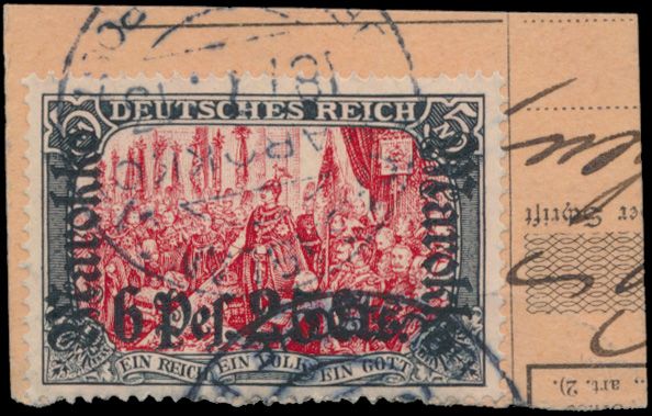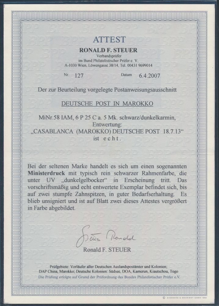 3192 0 imageMorocco Deutsche Post, N° 58 IAM Zgn. Ministerial print '6p. 25c. auf 5M. black' and dark carmine cancelled Casablanca, 2 slightly blunt teeth, stamp on fragment, rare, certificate Ronald Steuer, vf (Mi. €1,500)(Image 1) (Image 2)
