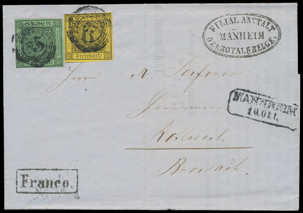 3188 image1857 Letter from Mannheim to Rotweil at the Belgian branch of Royale Belge with "3fr. green" and "6kr. yellow" (both fine ex.), vf(Image 1) (Image 2)