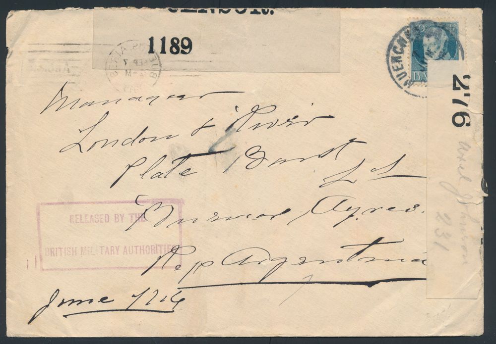 3189 image1918, n° 97 (Yv.) on letter 1918 to Buenos Aires with censor's mark and "Released by the British Military Authorities", vf(Image 1) (Image 2)