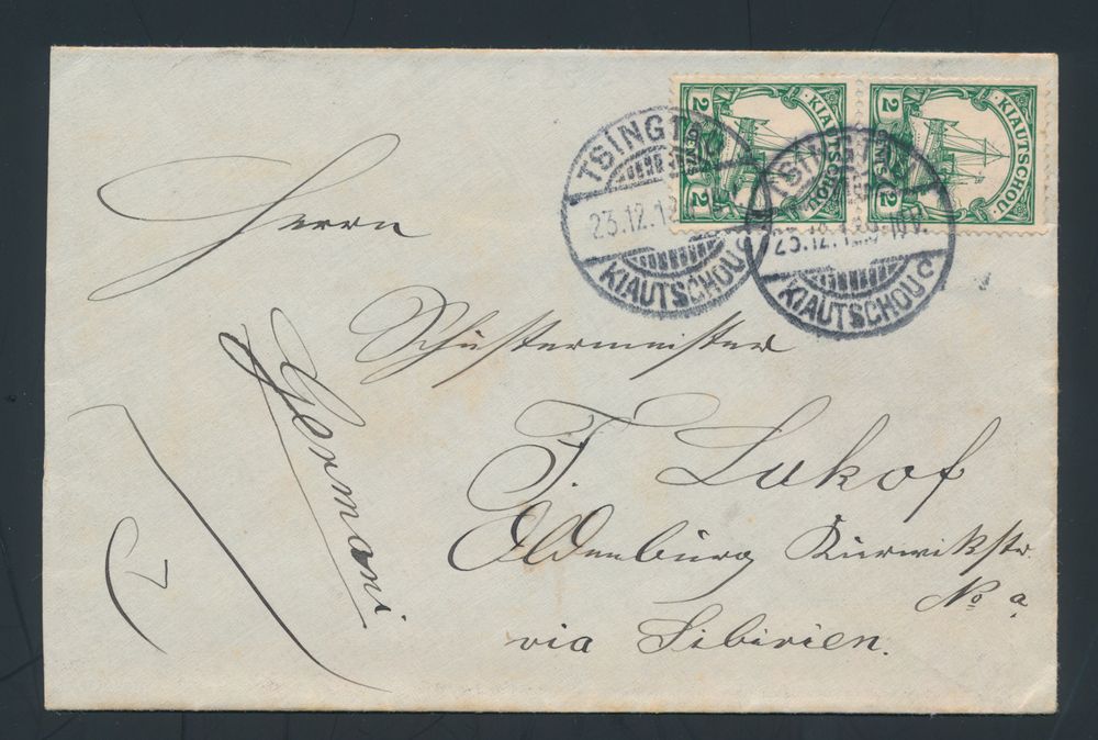 3191 image1912 Kiautschou N° 25 (vertical pair) cancelled 23-12-12 in Kiautschou, on letter to Germany, vf(Image 1) (Image 2)