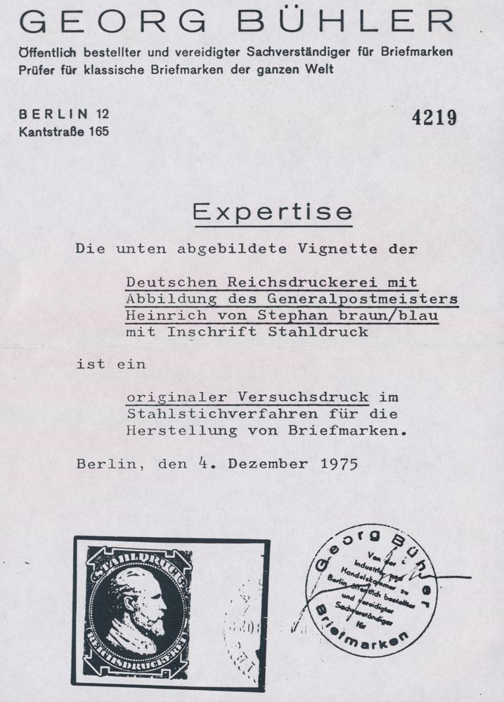 3235 ng imageVignette Rijksdrukkerij with illustration of Heinrich von Stephan with inscription Stahldruck, Bühler certificate, vf(Image 1) (Image 2)