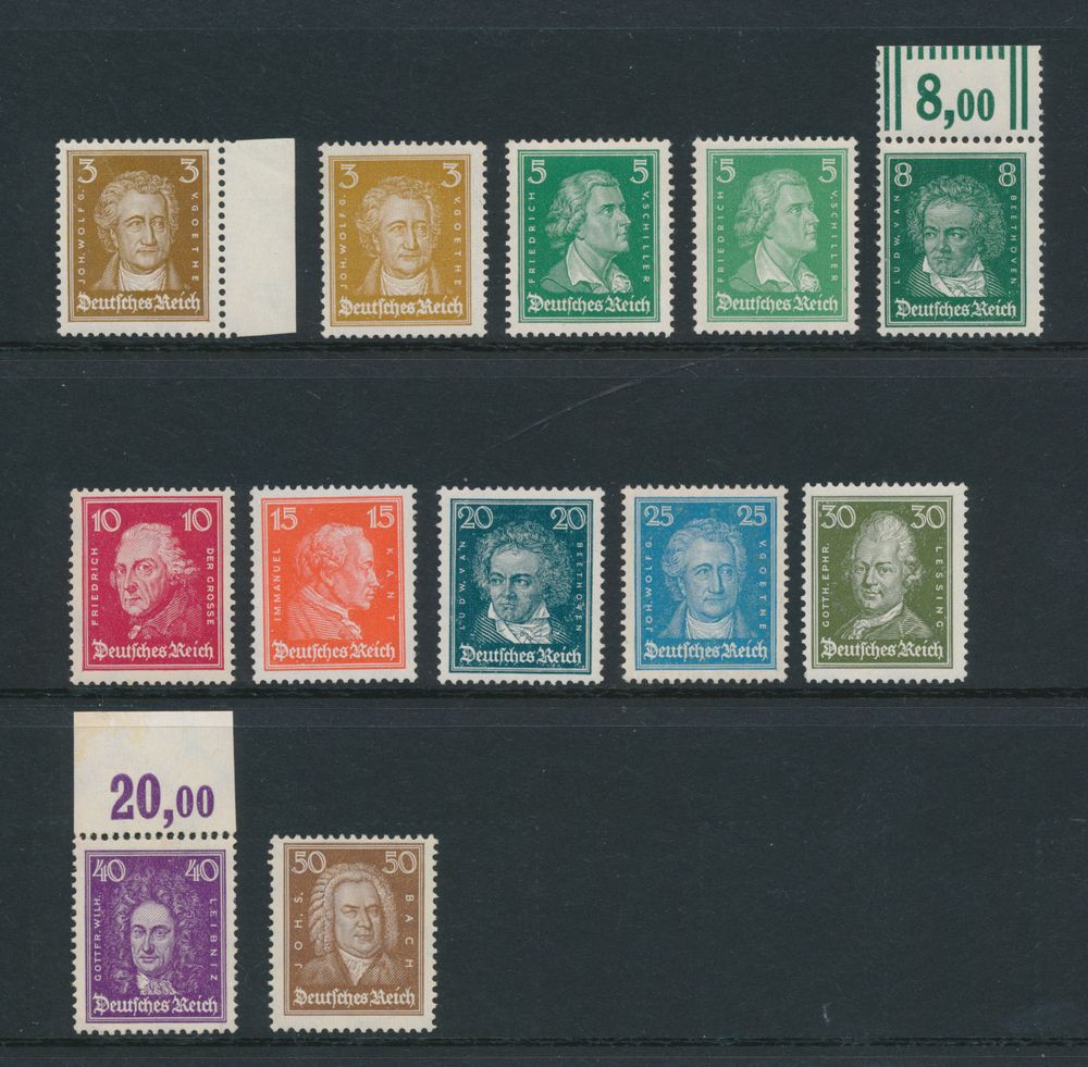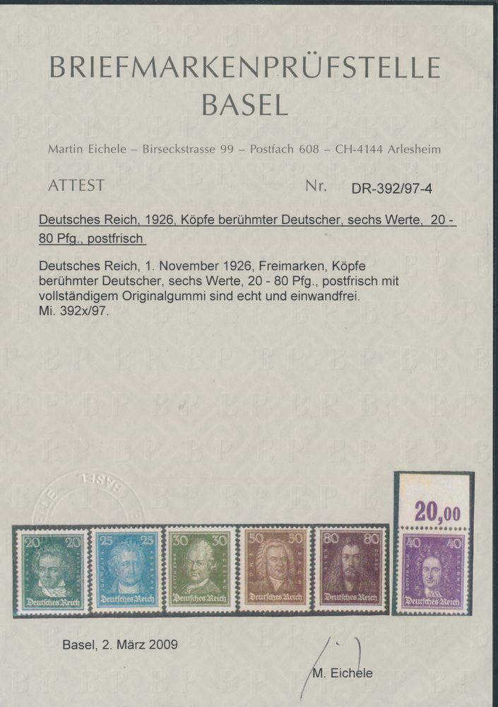 3227 og imageN 385/97 "1926 - famous people complete, 8 and 40pf." with upper margin, Eichele certificate, also "80pf." with sign Schlegel, vf (Mi. €1,200)(Image 1) (Image 2) (Image 3)