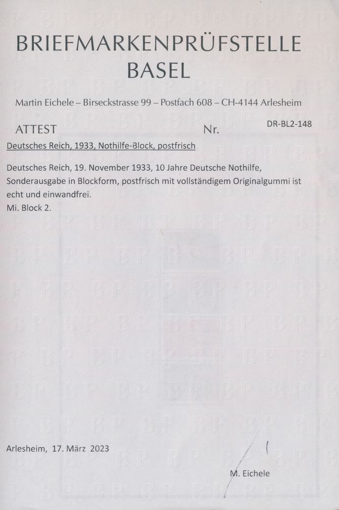 3239 nh imageBL 2 "1933 - 10 Jahre Deutsche Nothilfe" with Eichele certificate, vf (Mi. €6,000)(Image 1) (Image 2)