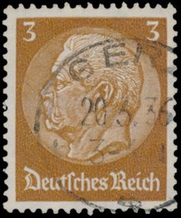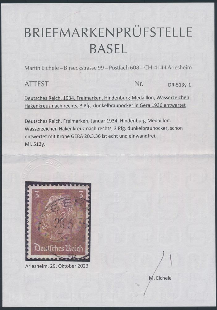 3234 0 imageN° 513Y "1934 - Hindenburg 3pf." with watermark "Hakenkreuz nach rechts" cancellation "GERA", Eichele certificate, rare, vf (Mi. €1,500) - see cover photo(Image 1) (Image 2)