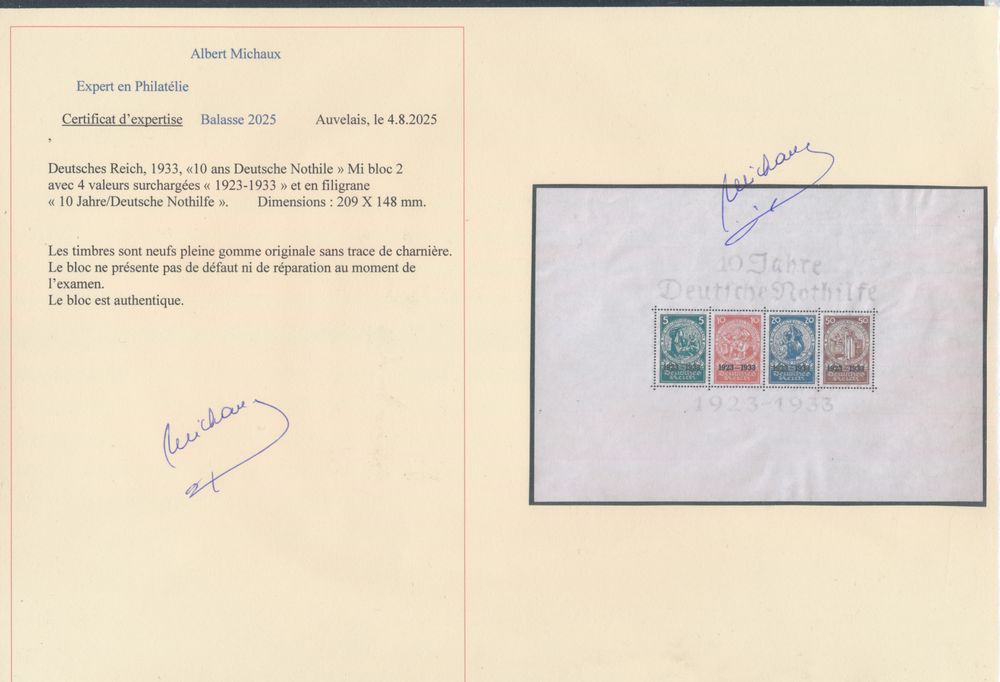 3240 nh imageBL 2 "1933 - 10 Jahre Deutsche Nothilfe" with certificate, vf (Mi. €6,000)(Image 1) (Image 2)