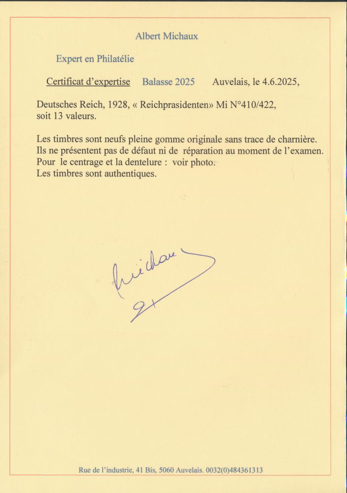 3230 nh imageN° 410/22 "1928 - Reich Presidents", Balasse certificate, "50pf." with margin and Schlegel sign, vf (Mi. €1,100)(Image 1) (Image 2) (Image 3)